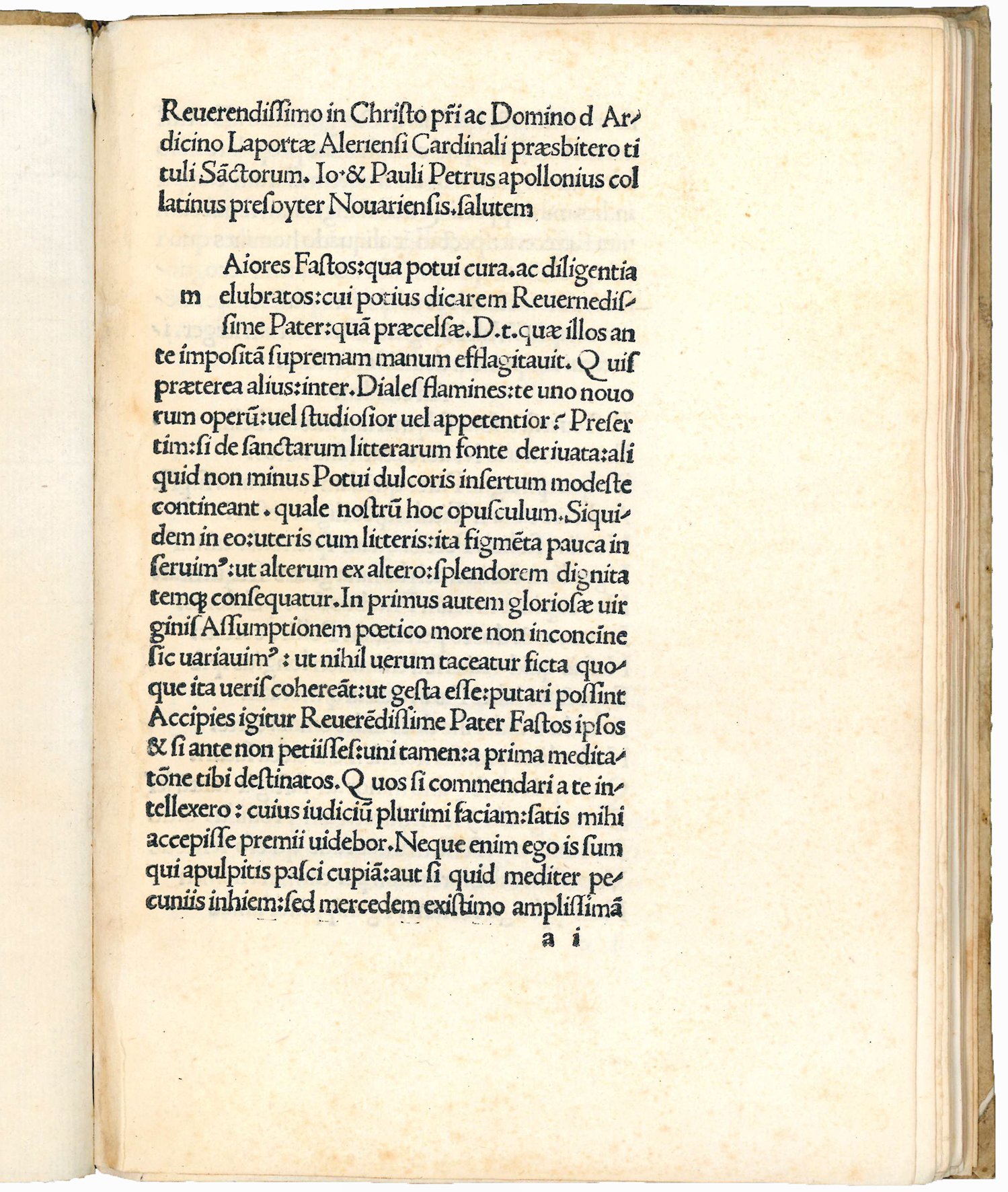 Extremely rare first edition, dedicated to Cardinal Ardicino della Porta and financed by the jurist Paolo Rognoni di Taegio, of this collection of “carmina sacra in praecipuas per annum festivitates aliisque occasionibus facta”, i.e. elegiac poems that seek to create, in contrast to Ovid's, a Christian etiology of religious festivities. The style is fluid and the Virgilian imitation, though obvious, is moderate.