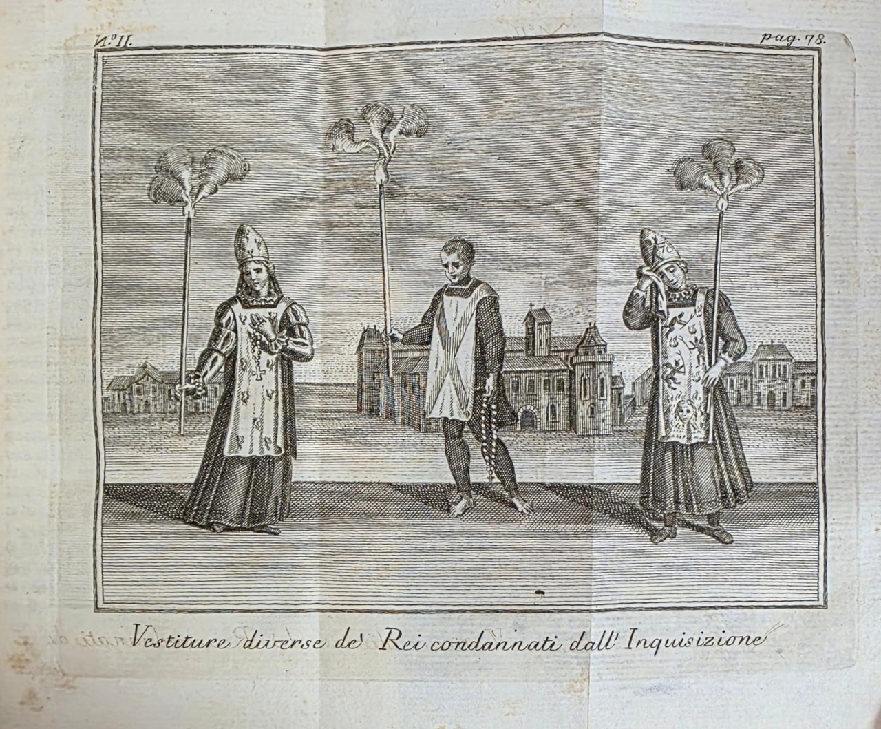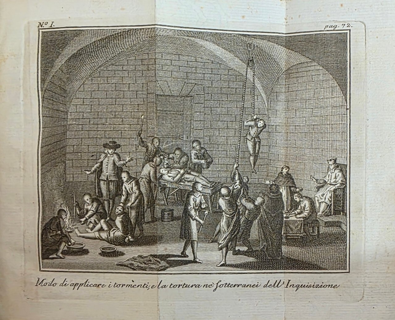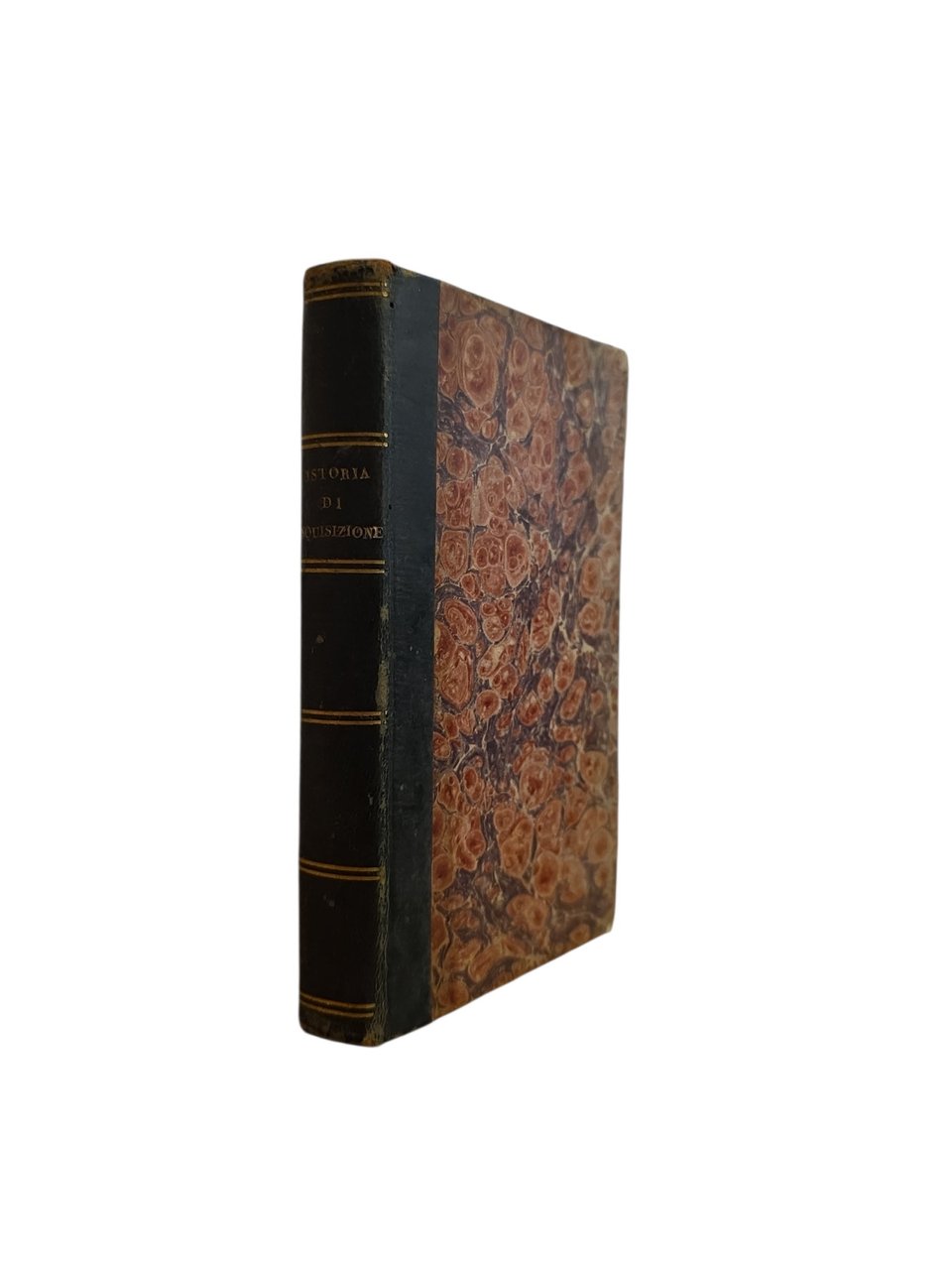 Esemplare poco comune e stampato senza indicazione d'autore per motivi di cautela, della più antica ricostruzione storica dell'Inquisizione redatta in Italia. In passato il testo era stato assegnato all'abate e prolifico scrittore Modesto Rastrelli (Firenze, 1752–1814), ma gli studi più recenti ne hanno riconosciuto la paternità a Francesco Becattini (Firenze, 1743–1813), instancabile autore di formazione illuministica. L'opera, animata da una dura e appassionata critica delle pratiche inquisitoriali — che ne determinò l'inserimento nell'Indice dei libri proibiti nel 1817 — ripercorre la nascita dell'Inquisizione e la sua espansione in Francia, Spagna, Portogallo, Italia, Malta e altri territori; descrive gli autodafé e gli strumenti di tortura, per poi soffermarsi in modo più analitico sull'attività del tribunale inquisitoriale a Firenze e in Toscana. Ampio spazio è dedicato ai procedimenti contro Paleario e Galileo, i Socini e Carnesecchi, le presunte streghe di Siena e Pandolfo Ricasoli. Di particolare rilievo risulta inoltre la relazione conclusiva, intitolata Della carcerazione del dottor Tommaso Crudeli di Poppi e della procedura intentata contro di lui dal Tribunale del Sant'Uffizio di Firenze nell'anno 1739. 2 tavv. incise ripiegate f. t. (una raffigurante le torture inquisitoriali, l'altra le vestiture dei condannati). in dodicesimo leg. mezza pelle, piatti marmorizzati, tagli spruzzati, titolo in oro al dorso pp. (2), 259, (1) Buono (Good) Buon es., fioriture sparse.