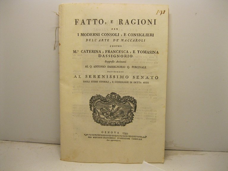 Fatto e ragioni per i moderni consoli e consiglieri dell'arte de' Maccaroli contro M. Caterina, Francesca e Tomasina Dassignorio supposte attinenti al Q. Antonio Dassignorio Q. Percivale rassegnate al serenissimo senato