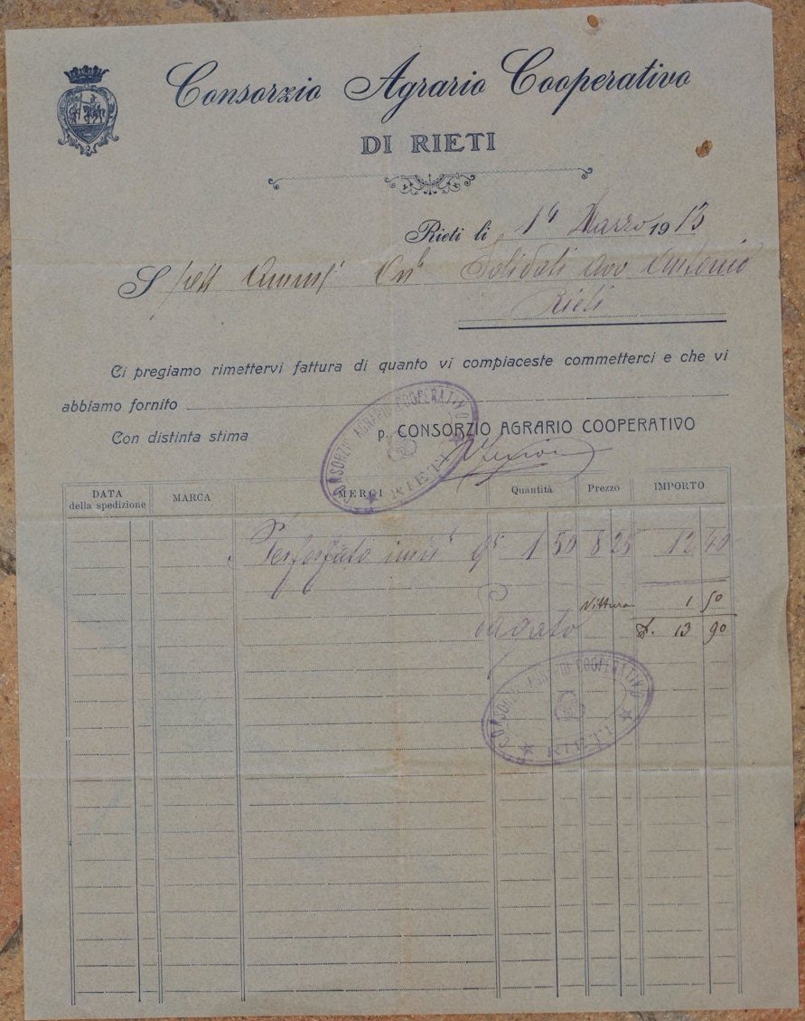 FATTURA CONSORZIO AGRARIO COOPERATIVO DI RIETI RIETI LI 14 MARZO 1913