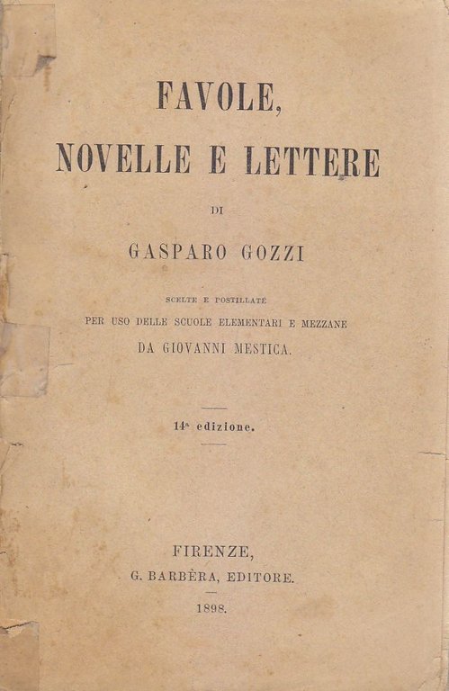 FAVOLE NOVELLE E LETTERE di Gasparo Gozzi Scelte e postillate per uso delle scuole elementari e mezzane da Giovanni Mestica. Firenze, Barbera editore 1898. VIII + 261 Pagine. copertina non editoriale in tutta tela. Dimensioni: 12 x 19 cm. Stato di conservazione: buono (pagine ingiallite, copertina non originale)