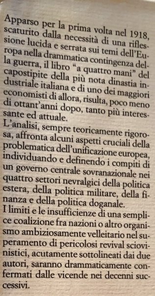 Soggetti: Politica, Scienze politiche, Unione Europea, Storia contemporanea, Guerre Mondiali, Confederazioni, Federalismo, Ideologie, Fascismo, Totalitarismo, Organismi sovranazionali, Nazionalismo, Stati, Sovranità statale, Economia, Diplomazia, Politica estera, Grandi potenze, Alleanze, Democrazia, Controllo, Fisco, Governo, Potere, Gestione, Amministrazione, Unificazione, Frontiere, Tariffe doganali, Dazi, Esportazioni, Mercato comune, Esercito, Finanza, Liberalismo, Idee, Pensiero politico, Intellettuali, Altiero Spinelli, Industriali italiani, Capitani di industria, Novecento, Nazioni, Trasporti, Borghesia, FIAT, Liberismo, Einaudi, Pantaleoni, Barone, Pareto, Dumping, Scambi internazionali, Libri Vintage, Fuori catalogo, Dibattiti, 1918, Politics, Political Sciences, European Union, Contemporary History, World Wars, Confederations, Federalism, Ideologies, Totalitarianism, Supranational Organisms, Nationalism, States, State Sovereignty, Economy, Diplomacy, Foreign Policy, Great Powers, Alliances, Democracy, Control, Taxation, Government, Power, Management, Administration, Unification, Borders, Customs Tariffs, Duties, Exports, Common Market, Army, Finance, Liberalism, Ideas, Political Thinking, Intellectuals, Italian Industrialists, Captains of Industry, Twentieth Century, Nations, Transportation, Bourgeoisie, Liberalism, International exchanges, Books out of print