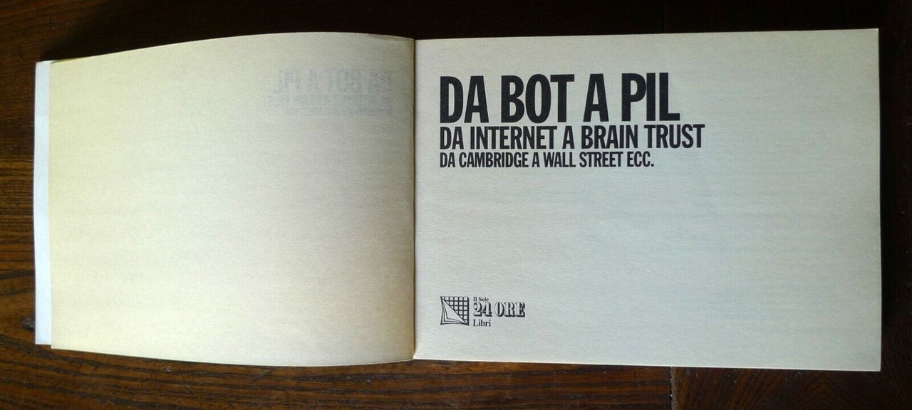 DA BOT A PILDA INTERNET A BRAIN TRUSTDA CAMBRIDGE A WALL STREE ECC.Ideazione e progettazione di Federico Maggioni.Il Sole 24 Ore Pirola, Milano 1995,prima edizione: giugno 1995,brossura, 21x15 cm., pp.158illustrato con vignette umoristiche in bianco e nero,ISBN: 88-7187-552-4,peso: g.300