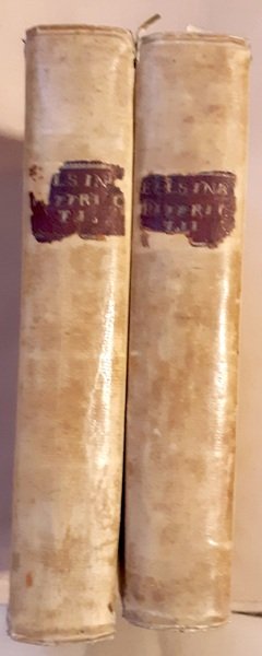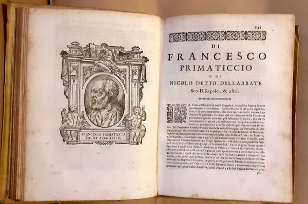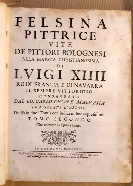 Due voll. (+1), in -4°, pp. (16), 581, (1); (4), 606, (2); pp. XX (2), 344. Nel Malvasia cinquanta ritratti (in otto di questi è incisa in questa rara prima edizione solo la cornice vuota) che precedono le biografie e numerose incisioni, anche a piena pagina; nel Crespi 44 tavole ft con i ritratti in cornice incisi di altrettanti artisti. Piena pergamena, tasselli al dorso, tagli spruzzati. È la prima edizione di questa fondamentale opera biografica, caposaldo della storia dell’arte bolognese e di grande importanza per la storia dell’arte italiana. Il Crespi è il supplemento a quest’opera, con frontespizio in rosso e nero, vignetta incisa con lo stemma del dedicatario, illustrazioni nel testo, testatine, finalini. Ottimo esemplare.The first edition of this reference biographic work on the Italian art history. The Crespi is the appendix to the Malvasia.