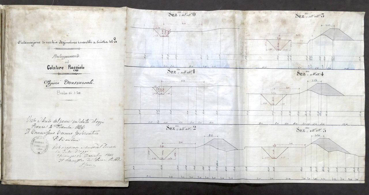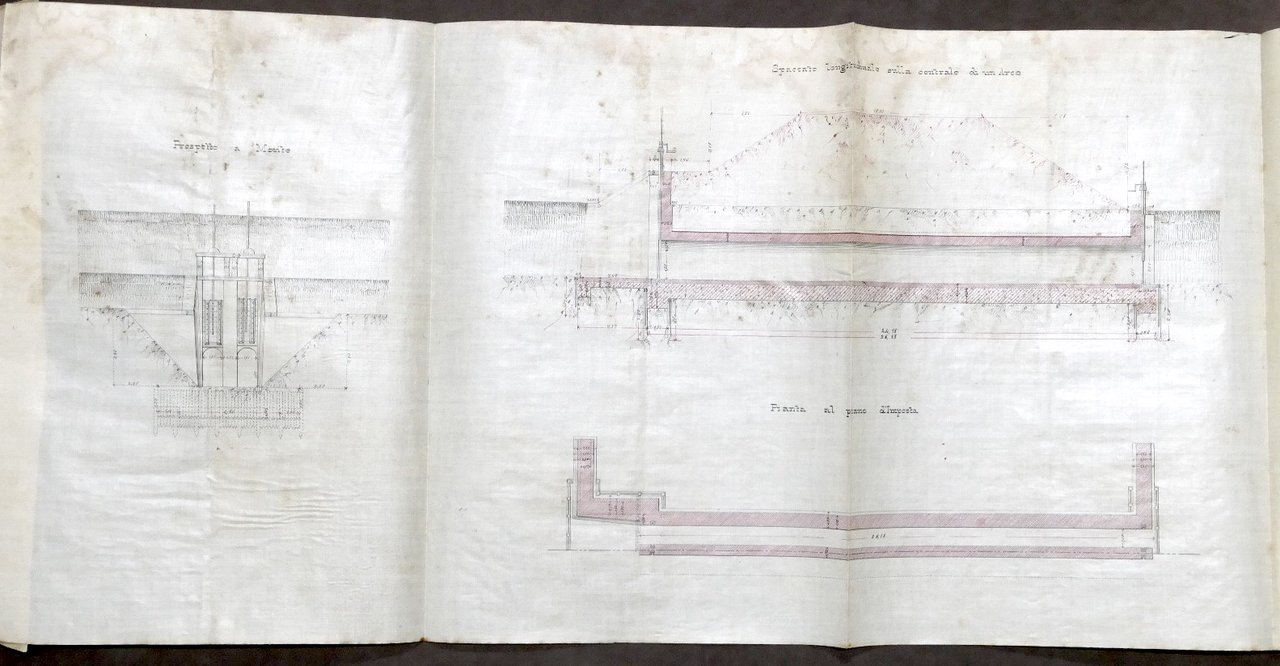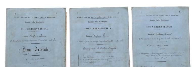 Ferrovie - Società Italiana per le Strade Ferrate Meridionali - Servizio delle Costruzioni Linea Voghera Pavia - Tronco Voghera Pavia - Anno 1866 Sistemazione di vecchie Arginature Consortili a sinistra del Po 3 fascicoli che contengono disegni tecnici e planimetrie ripiegate. - Piano Generale - Piano Parcellario del Colatore Roggiolo e Prolungamento del Colatore Roggiolo (Profilo Longitudinale) - Prolungamento del Colatore Roggiolo - Acquedotto a due luci Condizioni molto buone. Copertine con piccoli segni del tempo.
