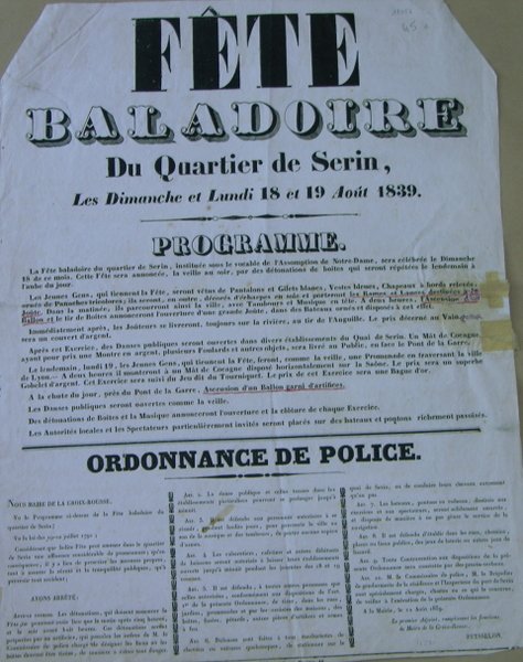 Fête baladoire du quartier de Serin (Croix-Rousse) , les 18 et 19 août 1839 - Programme, ordonnance de police