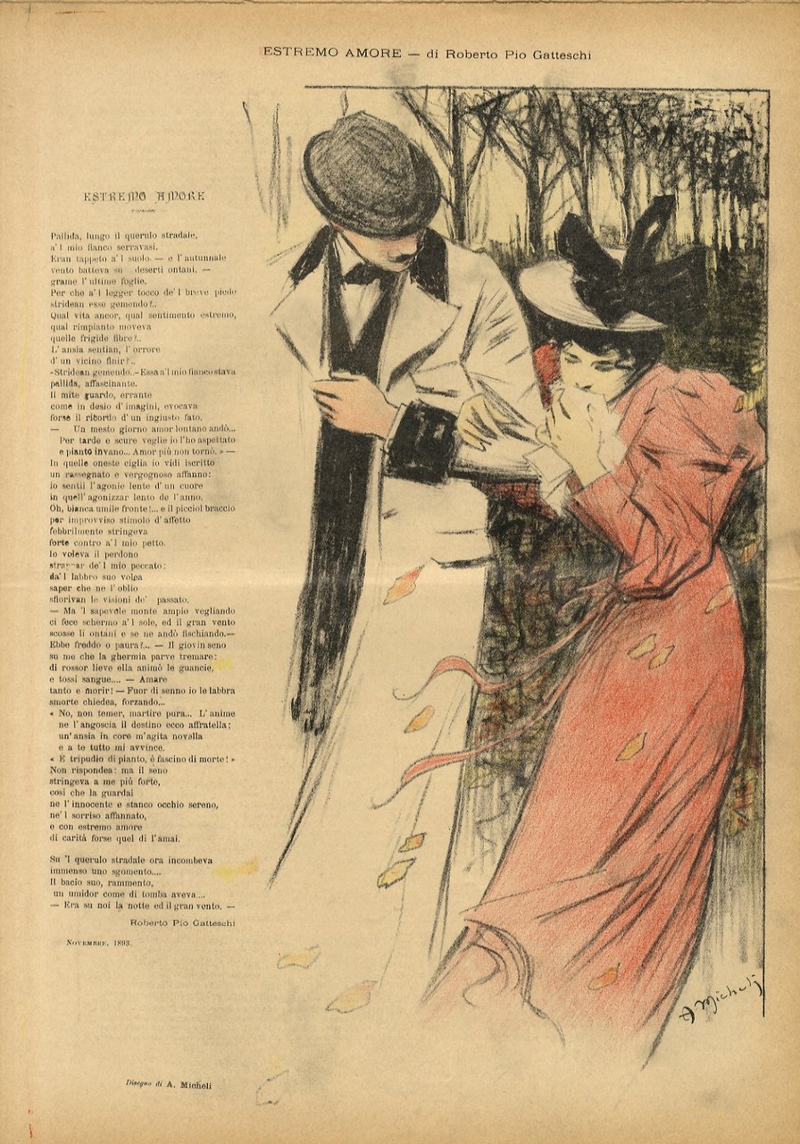 Firenze, Stab. Lit. Benelli e Gambi, 1896, un fascicolo in-folio, copertine editoriali illustrate da due litografie originali a colori (quella anteriore - "La novella" - di Giorgio Kienerk, quella posteriore - "Estremo amore" - di A. Micheli), pp. [8], copertine comprese. Sulle pagine centrali due grandi litografie originali a colori: "Una opportuna offerta", firmata da A. Scarselli e "Osteria della Romagnola" di Telemaco Signorini. Forse il periodico italiano più raro e ricercato della fine dell'Ottocento, impresso in poche copie, con la inusuale tecnica della pietra litografica su carta da giornale. Eccellenti condizioni, come raramente si trova.