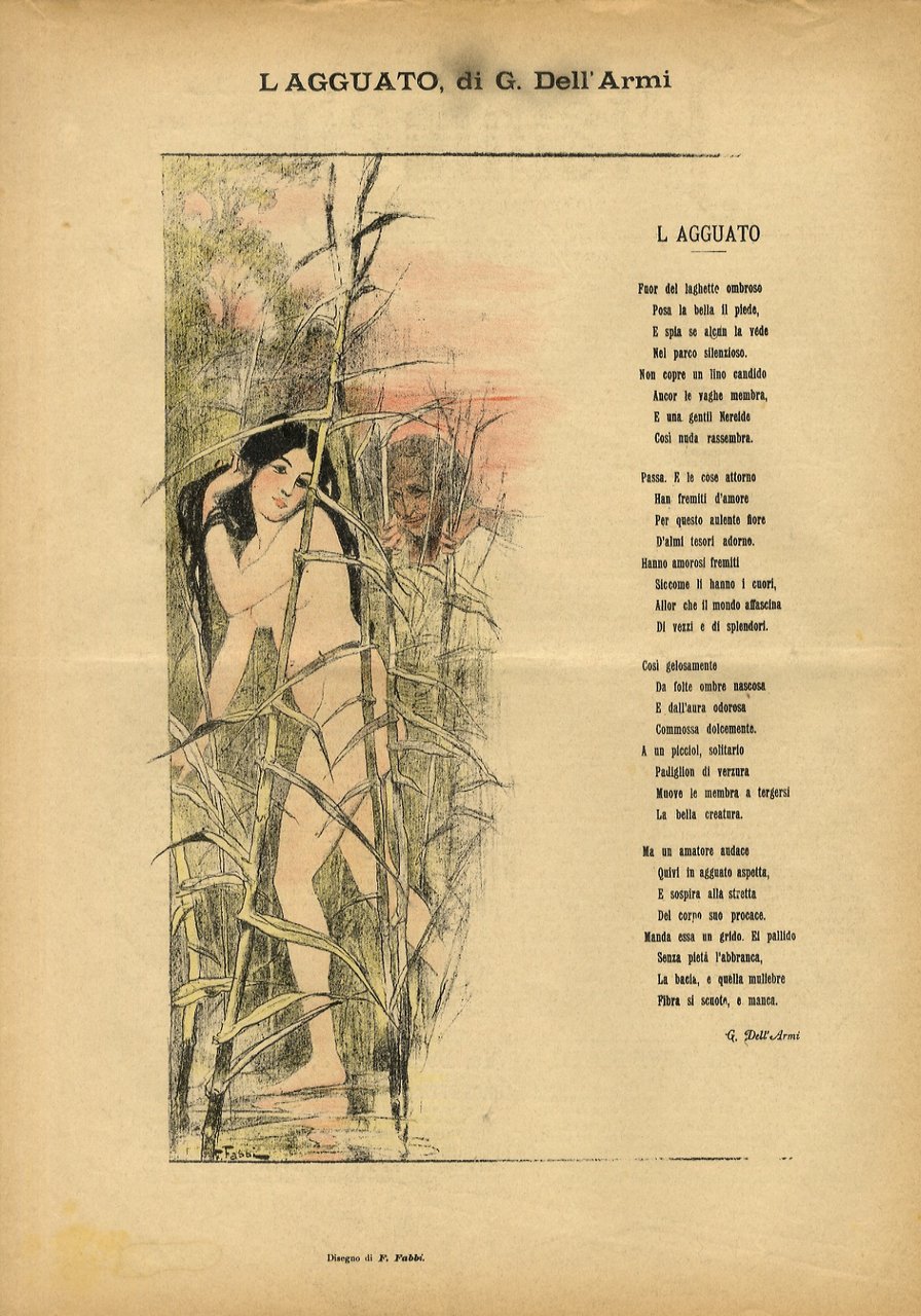Firenze, Stab. Lit. Benelli e Gambi, 1896, un fascicolo in-folio, copertine editoriali illustrate da due litografie originali a colori (quella anteriore - "Oreste e Pilade" - di A. Scarselli, quella posteriore - "L'agguato" - di Fabio Fabbi), pp. [8], copertine comprese. Sulle pagine centrali due grandi litografie originali a colori: "La verità nell'arte", firmata da A. Scarselli e "Passione" di Giorgio Kienerk. Forse il periodico italiano più raro e ricercato della fine dell'Ottocento, impresso in poche copie, con la inusuale tecnica della pietra litografica su carta da giornale. Eccellenti condizioni, come raramente si trova.