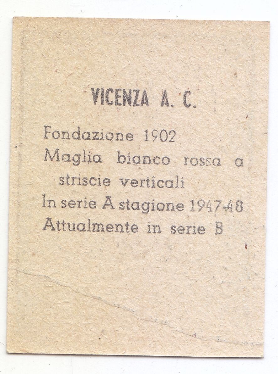 Bella figurina originale del Vicenza del 1949. La ditta produttrice dovrebbe essere la Mundus o la NanninaDimensioni: 4,5 x 3,5 cm. Stato di conservazione: ottimo