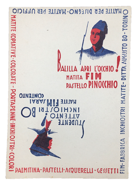 Foglio volante di cm. 19 ,3x13,8), impresso solo recto in rosso e in blu con FIGURE di mezzobusti di GOLIARDO con feluca blu e di BALILLA con fez, moschetto e baionetta inastata, entro cornice di prodotti in caratteri maiuscoli: FIM - Fabbrica Inchiostri Matite - Ditta Augusto Bo - Matite per disegno - Matite per ufficio - Matite copiative - colorate - Portapenne - Inchiostri - Colori - Palmitina [miscela derivata dalla torchiatura dell'olio di palma saponificato -stere della glicerina con acido palmitico per l'industria del sapone] - Pastelli - Acquerrelli - Gessetti. La FIM fu attiva a Torino dal 1838 al 1994.