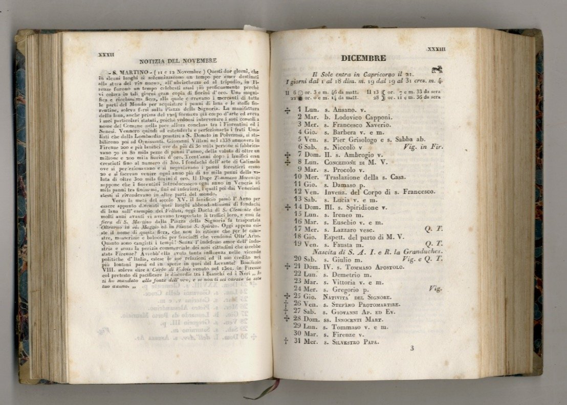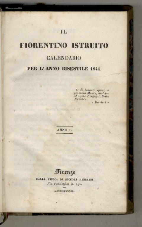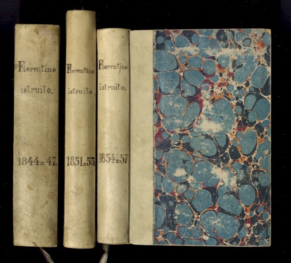 Firenze, dalla tipografia di Nicola Fabbrini; poi: nella tipografia di G.B. Campolmi; poi: editore G. Benelli; poi: Giuseppe Polverini, 1844 - 1845 - 1846 - 1847 - 1851 - 1852 - 1853 - 1854 - 1855 - 1856 - 1857, voll. 11 legati in 3, in-16 (un volume ha dimensioni leggermente maggiori degli altri due), uniforme legatura ottocentesca in mezza pergamena, titolo e date manoscritte all'epoca sui dorsi, piatti in carta marmorizzata, pp. XX, 115, [1] - XXXIV, 138 - XXXI, [1], 116, XII, [2] - 135, [1] - 126, [2] - XIX, [1], da 127 a 238 - 110, [2] - 16, [2] da 111 a 154, 45, [1] - 120 - 5, [1], XXX, [3], da 8 a 87, [1] - 128. Tutto il pubblicato di questo calendario, denso di notizie sulla città.