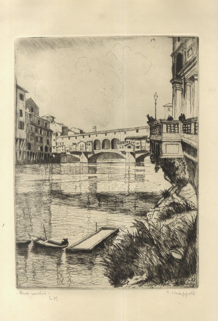 Firenze, Aldo Gonnelli Editore, 1947, in-folio, pp. [8], 14 magnifiche acqueforti su altrettante tavv. f.t., [2]. Pubblicazione a fogli sciolti contenuta entro cartella editoriale in mezza tela con piatti in cartone. Una quindicesima acquaforte è presente sul frontespizio. Al colophon finale: "Di queste acqueforti sono stampati dal maestro Gino Tarchiani dell'Istituto d'Arte di Firenze 75 esemplari su carta di China numerati da 1 a 75 e 175 su carta avorio numerati da 76 a 250". Questo esemplare fa parte della tiratura da 76 a 250 (n. 89). Ciascuna acquaforte reca il titolo, il numero di tiratura e la firma manoscritti da Chiappelli. Ottime condizioni.