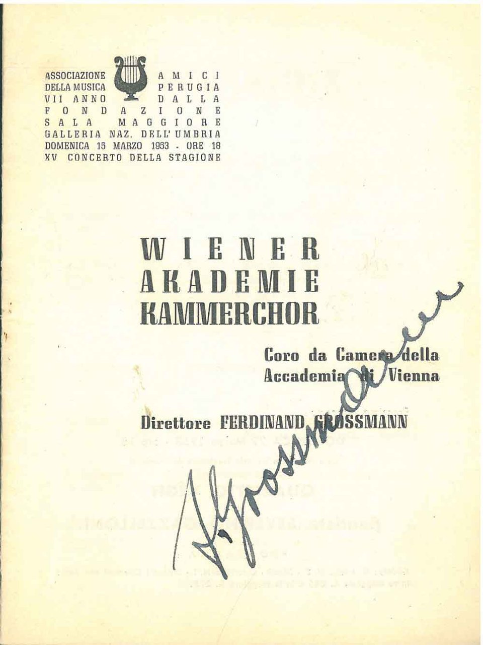 Firma autografa di Grossmann alla copertina del programma di sala del concerto con i Wiener Akademie Kammerchor (15 marzo 1953) per l'Associazione Amici della Musica di Perugia