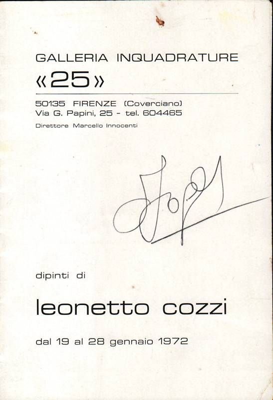 Firma autografa su invito ad una mostra personale tenutasi alla Galleria Inquadraure 25 di Firenze. Conosciuto come 'pittore dei fiori', Leonetto COZZI, nato a Livorno nel 1931 e morto a Cecina nel 2007, si è formato in ambiente pisano e livornese alla fine degli anni Quaranta del secolo scorso, e ha proseguito la propria carriera dapprima sperimentando tecniche e suggestioni pittoriche diverse e poi concentrando la propria ricerca intorno ad alcuni temi iconografici specifici, realizzati attraverso un uso della tecnica mista su carta