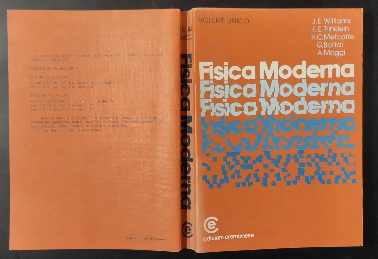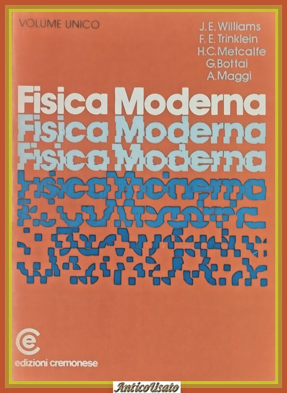 FISICA MODERNA di John Williams, Frederick E. Trinklein, H. Clarck Metcalfe, G. Bottai, A. Maggi. Cremonese Editore, 1979. XVI, 722 pagine, numerose illustrazioni in bianco e nero nel testo, alcune pagine di carta millimetrata a fine testo. Copertina editoriale in tutta tela. Stato di conservazione: molto buono (pagine normalmente ingiallite) Libro usato saggistica