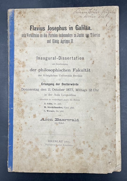 FLAVIUS JOSEPHUS in GALILÄA. Sein Verhältnis zu den Parteien insbesondere su JUSTUS von TIBERIAS und König AGRIPPA II. Inaugural-Dissertation der philosophischen Fakultät der K. Universität Breslau. in der Aula Leopoldina.