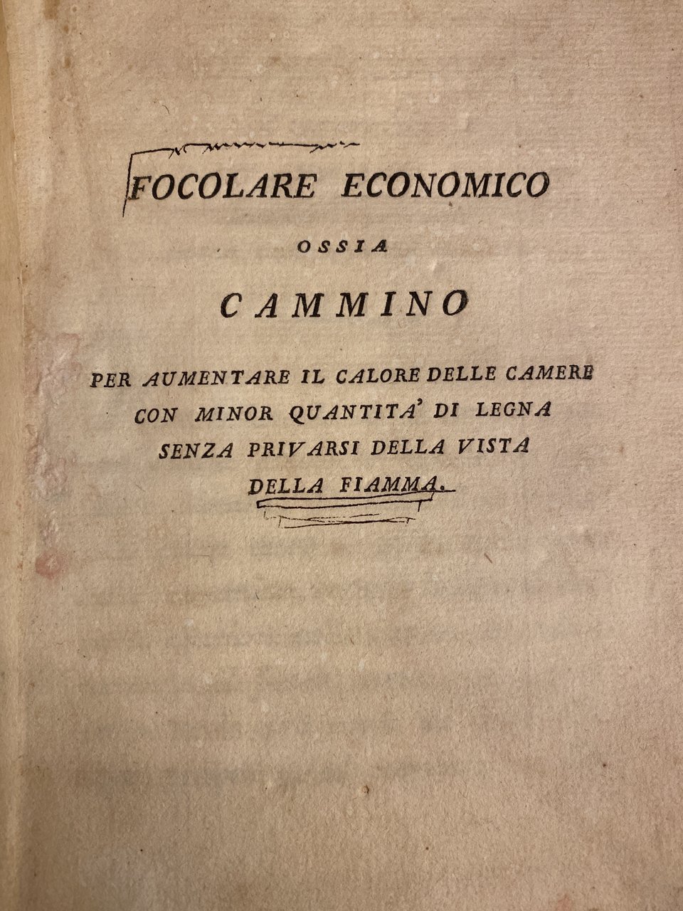 Volumetto in -16, legatura coeva cartacea muta screpolata, pp. 20 e 2 tavole incise ripiegate incise da Bianchi - Curiosissimo libro che parla di stufe e legna, andeddoti e curiosità. Si parla del "focolare economico d'invenzione dell'Avvocato Vincenzo virginio - membro ordinario della Real Socit Agraria".