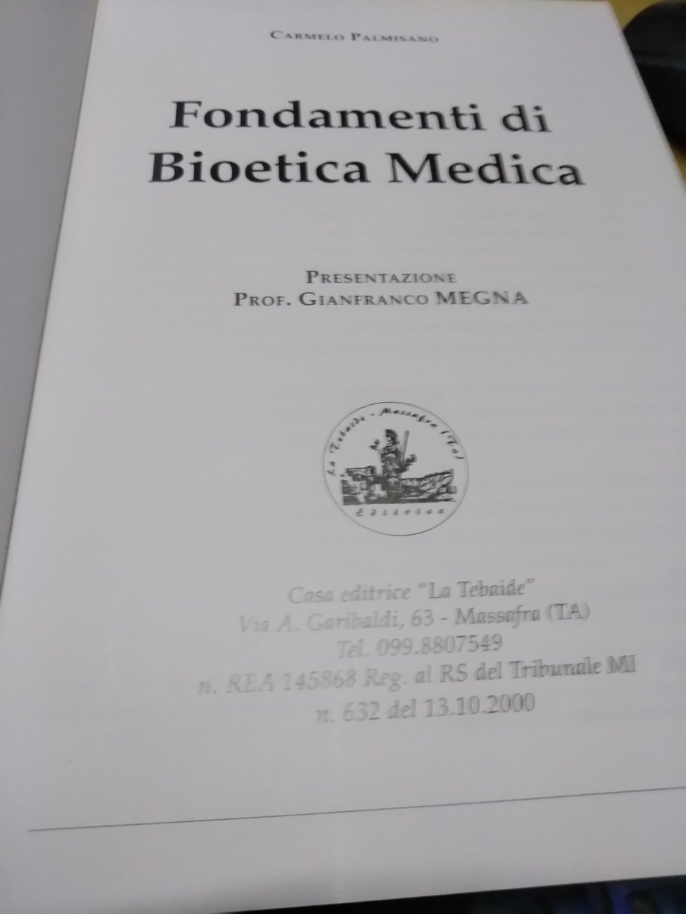 fondamenti di bioetica medica carmelo palmisano . taranto, la tebaide 2004 italiano, pp.431 copertina con tracce di polvere