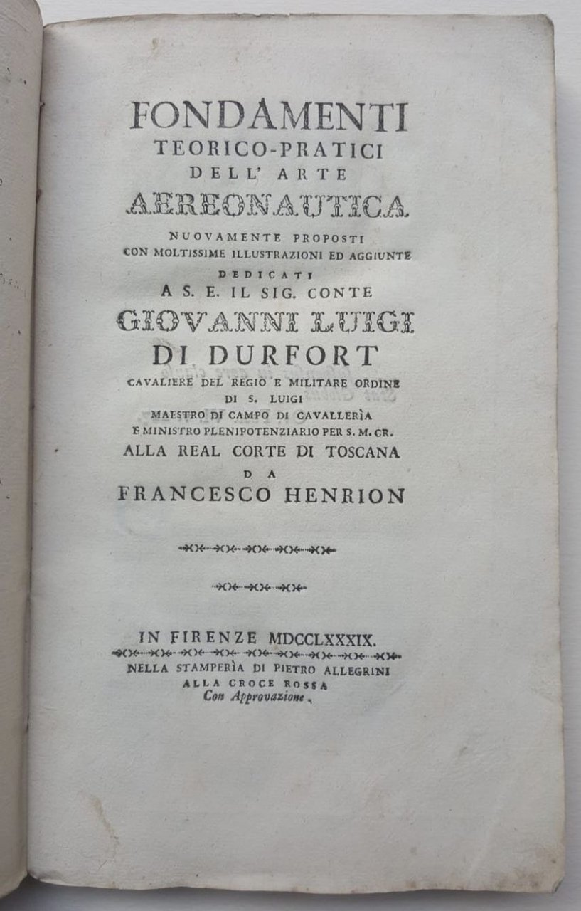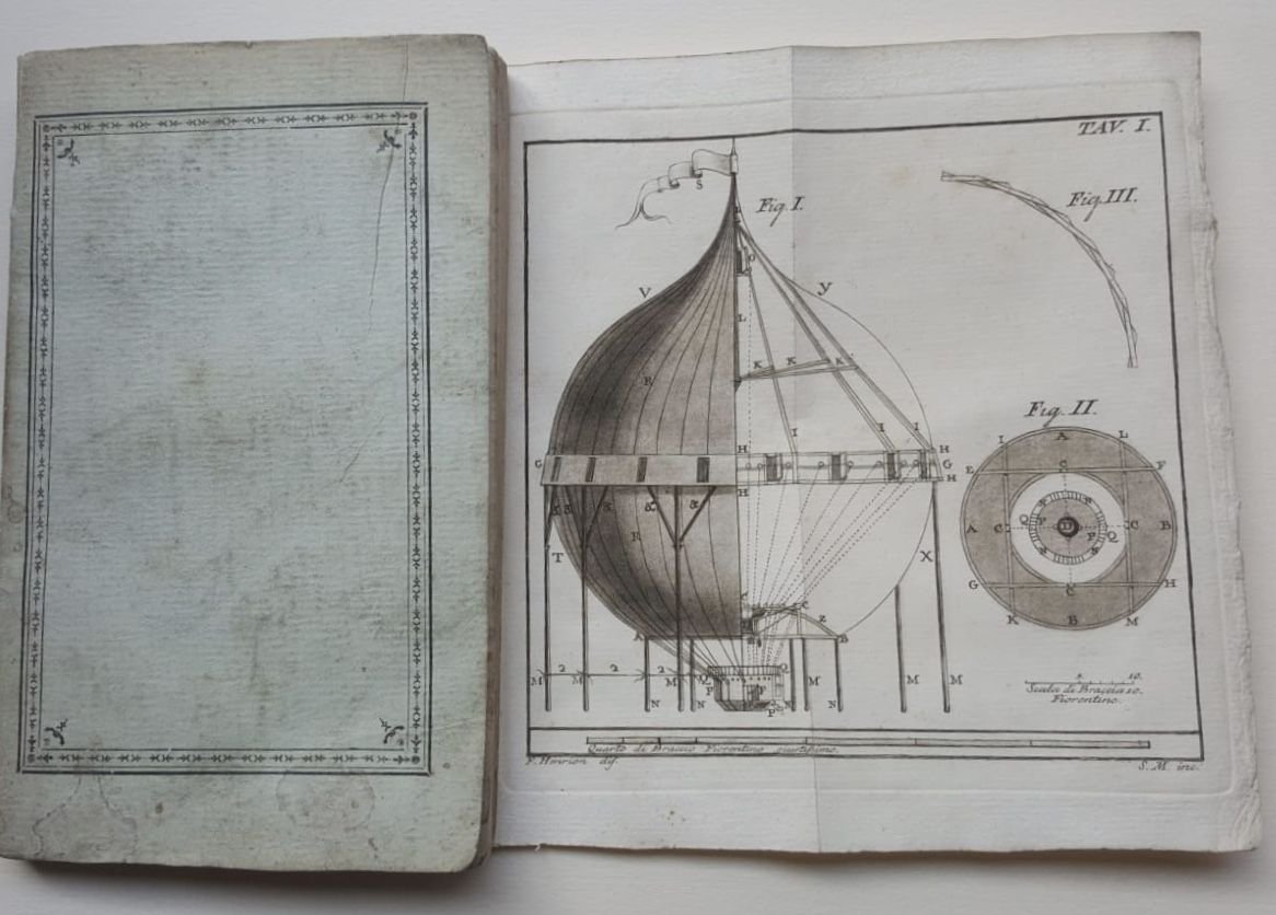 >in-8 (215 x 132 mm), pp. 138, 4 tavole incise f.t. più volte ripiegate (2 relative a palloni aerostatici, una geografica con la scala delle miglia ed una con dimensioni e risultati di diverse macchine aerostatiche), bella brossura editoriale in carta azzurrina con raffinata cornicetta silografica ai piatti e al dorso, su cui compare impresso anche il titolo. Prima edizione di opera dedicata a Durfort divisa in quattro parti: la prima ricostruisce i vari tentativi sino ad allora fatti e tratta della scelta "delle arie e del metodo di sollevare le Macchine". Herion fu infatti l'inventore del metodo ad aria rarefatta contrapponendosi a quello infiammabile ad idrogeno dei francesi. La seconda parte tratta della costruzione e delle caratteristiche che devono avere gli Aerostati; la terza il modo di dirigersi nei viaggi e le precauzioni da utilizzare; infine la quarta è una digressione sui vantaggi che questa invenzione apporterà. L'autore Fr. Henrion (di Pistoia, ingegnere minerario, architetto, pittore, archivista delle decime granducali di Firenze, socio dell'Istituto delle scienze di Bologna) fu autore di quattro memorie sull'argomento, tutte rare. Fu il primo a dare a Firenze lo spettacolo d'un pallone volante nel 1784. Ottimo esemplare. Caproni-Bertarelli, pp.31-32. Boffito, p. 219.