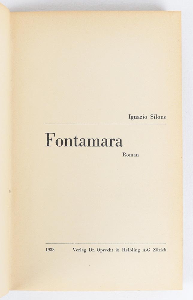 LIBROEdizione originale con réclame di «Der Fascismus» nelle pagine finali.Dorso lievemente angolato, timbro di biblioteca socialista estinta al contropiatto anteriore («Arbeiterunion Pratteln») e traccia di elemento rimosso al contropiatto posteriore; timbretto con data «28. Mai 1973» all’occhiello; per il resto ottimo esemplare con una grafica di copertina diversa da quella usualmente attestata sulle varie tirature: mantenendo identico carattere tipografico e corpo, qui il nome dell’autore precede il titolo e una linea in leggera diagonale separa i due elementi, attraversando l’intero piatto anteriore e il dorso («I. Silone | — | Fontamara | Roman»).L’opera prima di Silone, composta a Davos dove l’autore risedeva in incognito per curare la tisi, divenne un clamoroso successo letterario e un caso editoriale: fu tradotta istantaneamente in ventisette lingue ed «ebbe un’enorme forza d’urto sull’opinione pubblica internazionale» (D’Eramo, p. 57). Più che decine di pamphlet politici, poté il romanzo allegorico antifascista di un comunista fresco di espulsione dal partito causa purga staliniana. -- Eppure, il percorso alla pubblicazione fu costellato di rifiuti e pareri negativi, provenienti soprattutto dal circuito dei fuoriusciti italiani: furono invece gli amici svizzeri di lingua tedesca ad apprezzare il romanzo e sostenerne la prima edizione, che avvenne a Zurigo nella traduzione di Nettie Sutro, sotto le insegne di «un commissionario che firma come editore» (ivi, p. 60), Oprecht & Helbing, nel 1933. -- Dopo una prima tiratura di 2000 copie nell’aprile 1933 (in parte emessa sotto l’insegna dell’«Universum-Bücherei» di Basilea), verso la fine dell’anno Oprecht & Helbling procurò la presente ristampa, con aggiunte in fine quattro pagine di presentazione dell’«imminente» «Fascismus»: «Der Fascismus» uscirà con data 1934 già sotto la nuova sigla editoriale «Europa Verlag», nel frattempo creata ad hoc da Emil Oprecht sulla scia del successo di «Fontamara».D’Eramo, Ignazio Silone (Roma 2014), pp. 58-66; Moloney, Nettie Sutro’s German Translation of Silone’s Fontamara (Modern Language Review 91:4, pp. 878-85)