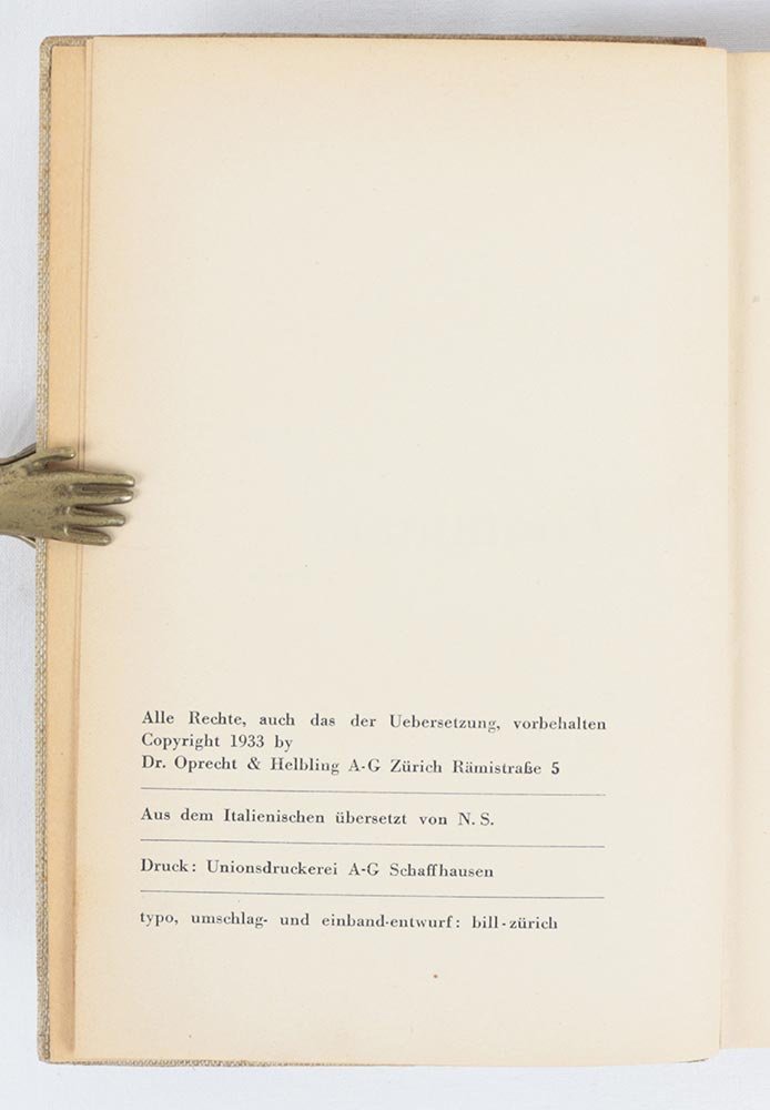 - Verlag Dr. Oprecht & Helbling A-G (Druck: Unionsdruckerei A-G, Schaffhausen | typo- umschlag- und einband-entwurf:, bill-zürich),