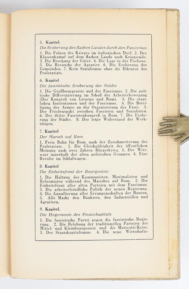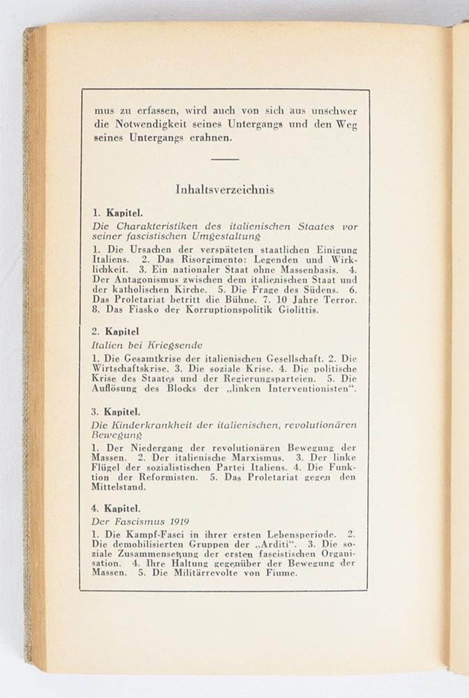 - pp. 210 [6: «Inhalt» e quattro pagine promozionali dell’imminente «Fascismus»]; fogli di guardia in carta bianca muta.