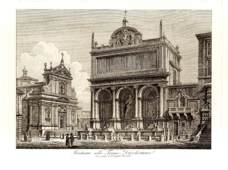 >incisione in rame,mm. 285x365 ed ampi  margini. Titolo lungo il margine inferiore  a destra il timbro a secco della calcografia. Tratta dalla serie monumentale di Fontane di Roma (iniziata nel 1837).   Acquaroni Antonio (1801-1874) si diceva che vedesse la città "con le seste negli occhi"; e fu in realtà impeccabile quanto a fedeltà documentaria. Quando la Calcografia Camerale volle arricchire il suo fondo di vedute romane, lo chiamò a far parte dei suoi collaboratori ordinari (come risulta anche da un Elenco degli incisori, Roma, Arch. di Stato).