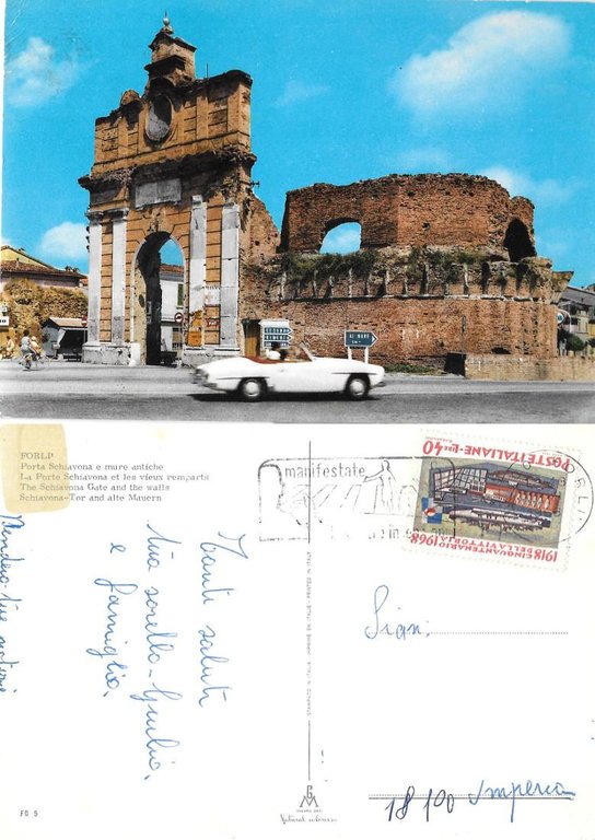 Forlì. Porta Schiavona e mura antiche. Viaggiata 1968. Auto