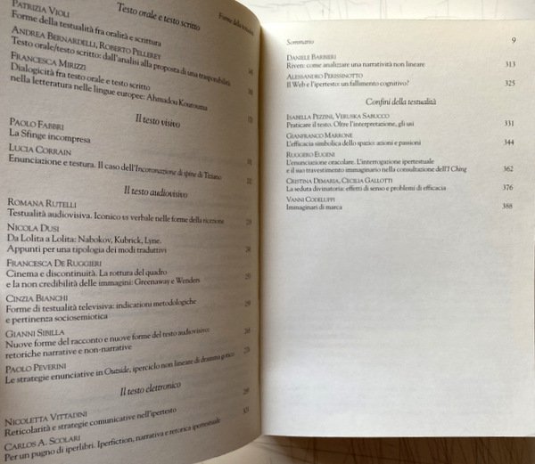 Soggetti: Linguistica, Lingua, Filosofia, Studi semiotici, Società, Politica, Comunicazione, Studi culturali interdisciplinari, Semiotica, Semiologia, Insegnamento, Apprendimento delle lingue, Didattica, Oralità, Scrittura, Segni, Letteratura, Critica, Consultazione, Modernità, Reti, Cinema, Videotape, Discorsività, Testualità, Fenomenologia, Testo letterario, Poesia, Giacomo Leopardi, Pietro Bembo, Utopia, Dialogicità, Simbolismo, Ahmadou Kourouma, Tiziano, Pittura, Incoronazione di spine, Testi audiovisivi, Ricezione, Riproducibilità, Fruizione, Pubblico, Immaginario, Visioni, Tradurre, Traduzioni, Peter Greenaway, Wim Wenders, Sociologia, Scienze sociali, Televisione, Schermo, Retorica, Narrativa, Outside, Ipertesto, Marketing, Strategie comunicative, Iperfiction, Iperlibri, Ebook, Riven, Interpretazione, Analisi, Lettura, Limiti, Forme ibride, Teorie letterarie, Linguaggio giovanile, Testi, Paradigma semiotico, Multimedialità, I-Ching, Divinazione, Arte divinatoria, Marche, Prodotti, Consumismo, Immaginario, Consumatori, Immagine, Marco Lombardi, Fedeltà, Clienti, Personificazione, Prestazioni, Eventi, Social marketing, Pubblicità, Advertising, Cultura, Antropologia, Testi interattivi, Arcade, Videogiochi, Videogame, Riflessi, Tassonomia, Reazioni, Rapidità, Parole, Genere, Libri Vintage Fuori catalogo, Bibliografia, Riferimento, Turing, Greimas, Contenuto, Spazio, Estetica, Marche globali, Andrea Semprini, Jean Noël Kapferer, Baudrillard, Lyotard, Postmodernismo, Klein, No-logo, Inconscio, Murray, Landow, Propp, Levin Schuking, Linguistics, Language, Philosophy, Semiotic Studies, Society, Politics, Communication, Interdisciplinary Cultural Studies, Semiotics, Semiology, Teaching, Language Learning, Didactics, Orality, Writing, Signs, Literature, Criticism, Consultation, Modernity, Networks, Speech, Textuality, Phenomenology, Literary text, Poetry, Dialogicity, Symbolism, Painting, Crowning with thorns, Audiovisual texts, Reception, Reproducibility, Fruition, Audience, Imaginary, Visions, Translate, Translations, Sociology, Social sciences, Television, Screen, Rhetoric, Narrative, Outside, Hypertext, Communication strategies, Hyperfiction, Hyperbooks, Interpretation, Analysis, Reading, Limits, Hybrid forms, Literary theories, Youth language, Texts, Semiotic paradigm, Multimedia, Divination, Divination art, Brands, Products, Consumerism, Imaginary, Consumers, Image, Loyalty, Customers, Personification, Performance, Events, Advertising, Culture, Anthropology, Interactive Texts, Reflections, Taxonomy, Reactions, Speed, Words, Genre, Out of print books, Bibliography, Reference, Content, Space, Aesthetics, Global brands, Postmodernism, Unconscious