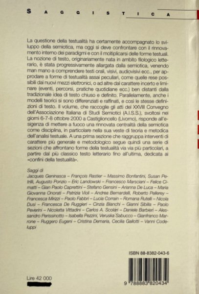 Il volume, che raccoglie gli atti del XXVIII Convegno dell'Associazione Italiana di Studi Semiotici (A.I.S.S.), svoltosi nei giorni 6-7-8 ottobre 2000 a Castiglioncello (Livorno), risponde all'esigenza di mettere a fuoco una rinnovata centralità della semiotica come disciplina, in particolare nella sua veste di teoria e metodica dell'analisi testuale. A una prima sezione che raggruppa interventi di carattere più generale e metodologico segue quindi una serie di sezioni che affrontano forme della testualità via via più particolari, a partire dal più classico testo letterario fino all'ultima, dedicata al confini della testualità.