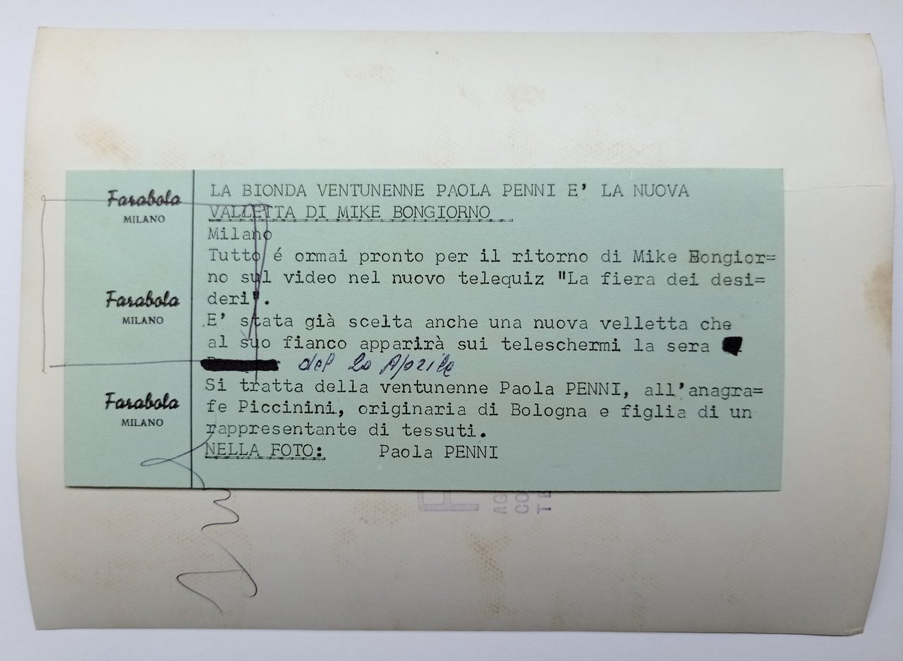 Foto dell'Agenzia Farabola Milano - Conduttrice televisiva Paola Penni 1960 ca. Paola Penni, nome d'arte di Paola Piccinini, è un'ex conduttrice televisiva, cantante e attrice italiana.Dimensioni: 20.5 x 15 cm ca. Condizioni molto buone.
