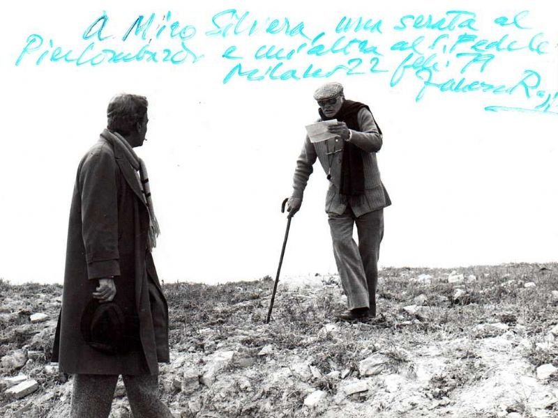 Fotografia in b/n di cm 18 x 23,5. Ritrae il regista e l'attore durante la lavorazione del film di Rosi 'Cristo si è fermato a Eboli'. Stampa dell'epoca alla gelatina ai sali d'argento. Al margine superiore dedica autografa firmata di Francesco Rosi a Miro Silvera.