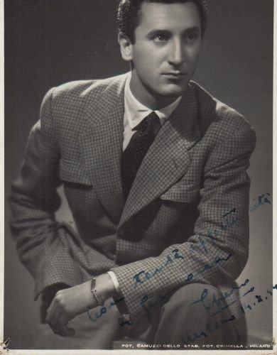 Ritratto foografico in b/n su cartoncino di cm 14,9 x 10,2; in basso dedica e firma autografe dell'attore. Foto di Camuzzi. Forellini ai quatro angoli.