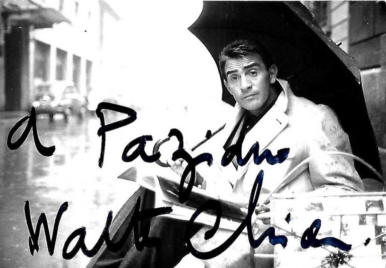 Fotografia di cm,14,5x10,2. Bella posa dell'attore seduto in paesaggio piovoso.