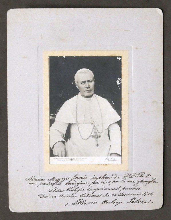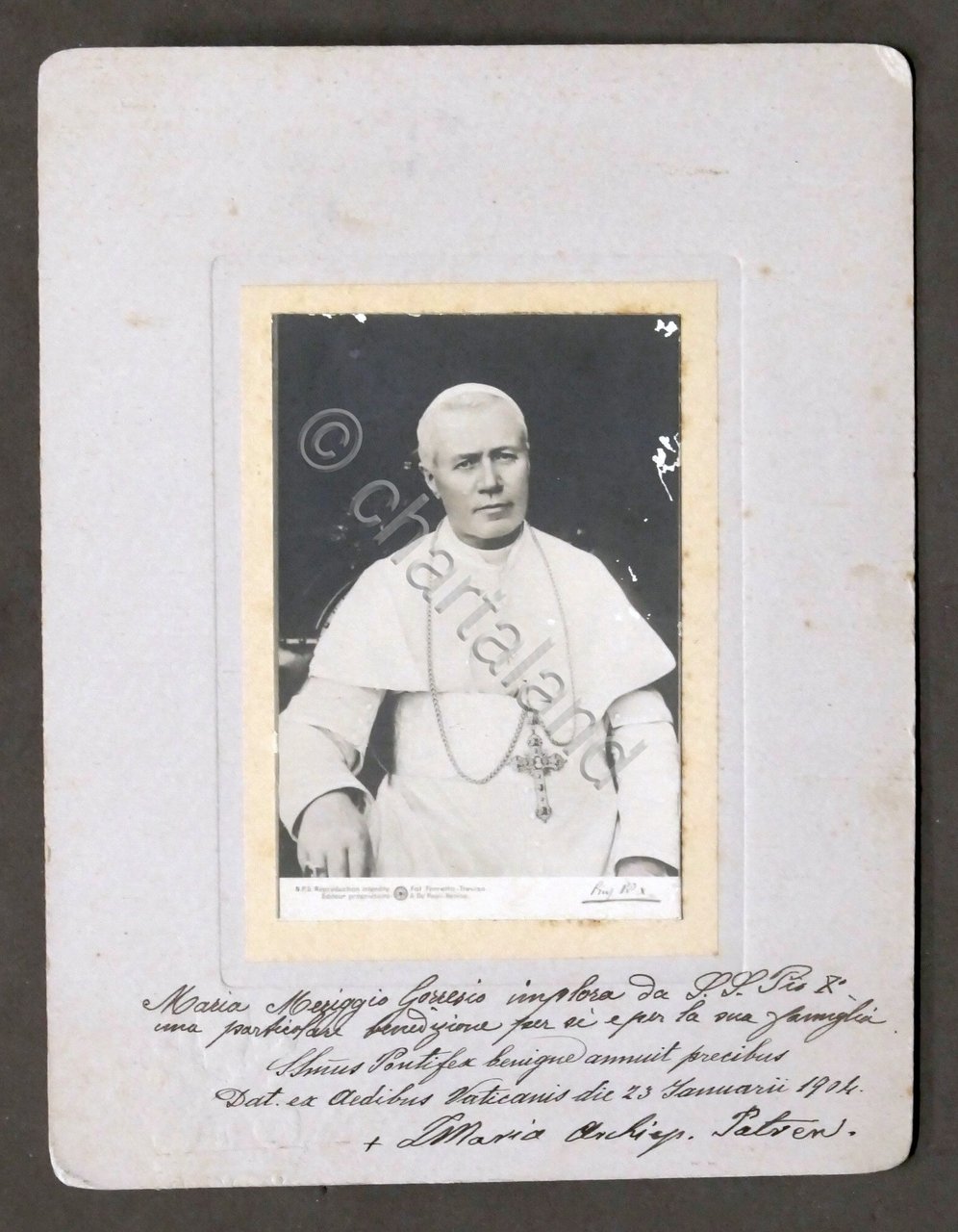 Fotografia d'epoca di Papa Pio X - 1904 Dimensioni foto: 6 x 9 cm ca. Dimensioni cartoncino, con richiesta di benedizione manoscritta: 13 x17 cm ca. Buone condizioni generali. Pio X (in latino: Pius PP. X, nato Giuseppe Melchiorre Sarto; Riese, 2 giugno 1835 – Roma, 20 agosto 1914) è stato il 257º vescovo di Roma e papa della Chiesa cattolica dal 4 agosto 1903 fino alla sua morte.