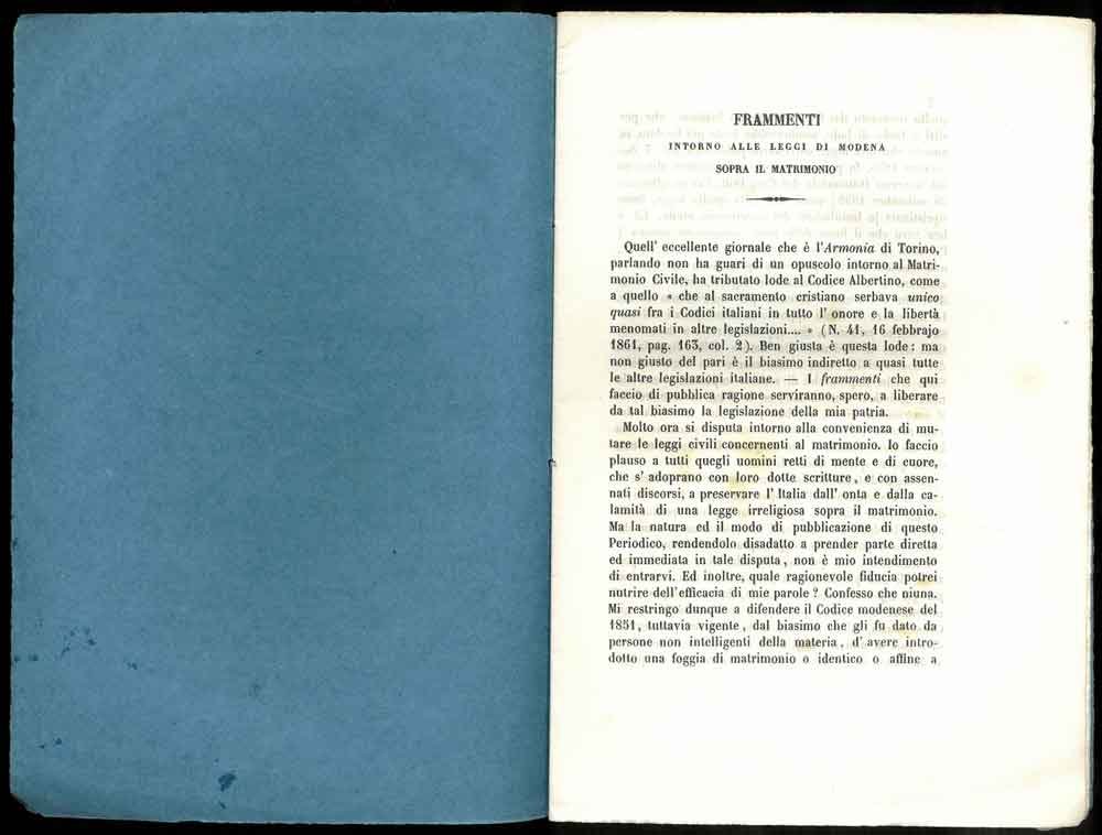 Frammenti intorno alle leggi di Modena sopra il matrimonio. Estratto dal Tomo IX degli Opuscoli religiosi, Letterarj e Moralj.