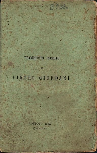 In-16°, legatura in brossura editoriale, pp. 24. (Raro opuscolo anticlericale pubblicato postumo a cura di Antonio Gussalli, (Vedi bibliografia pag. 204). In Italia ne venne proibita la stampa per l'argomento trattato contro il costume della chiesa. -(Pietro Giordani - Piacenza, 1º gennaio 1774 – Parma, 2 settembre 1848, è stato uno scrittore italiano). Fioriture e strappetti alla brossura e altre marginali tracce d'uso.