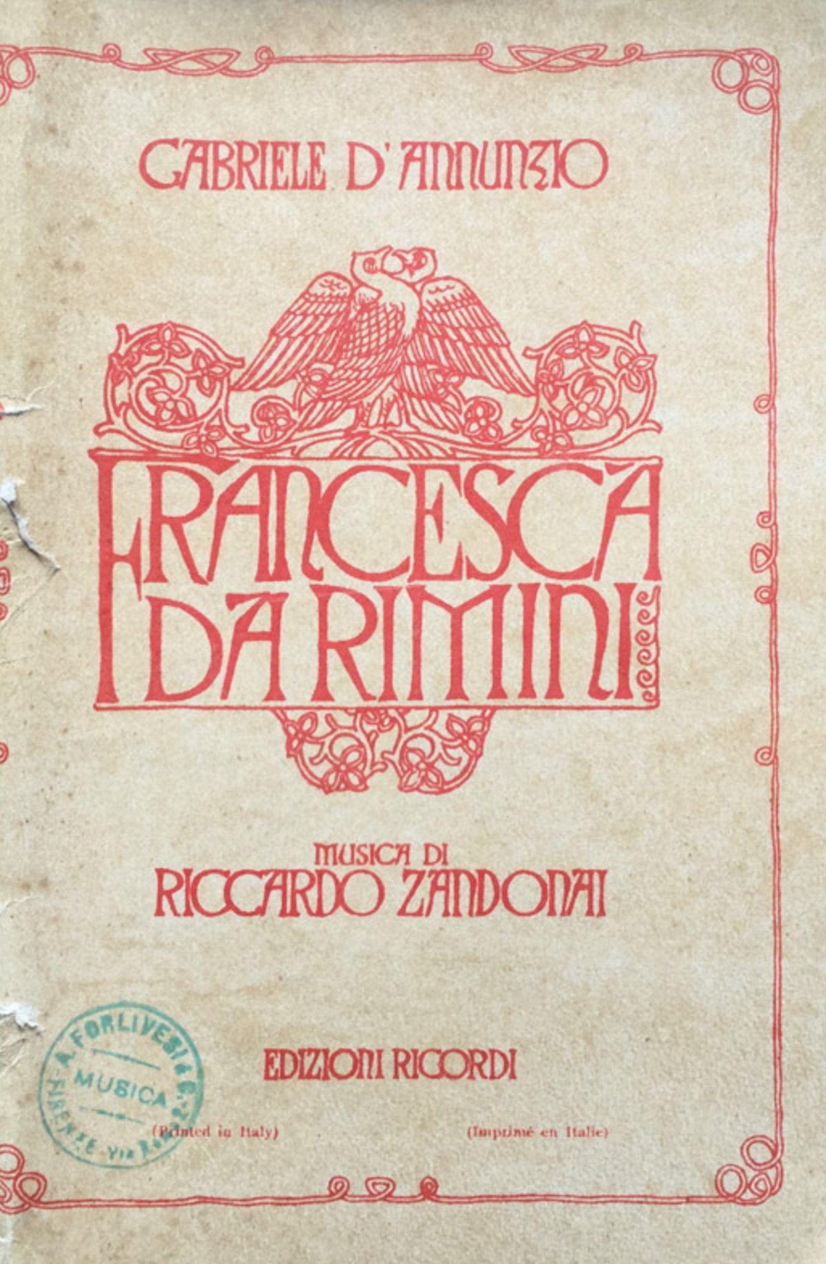 Gabriele D'Annunzio, Francesca da Rimini. Tragedia in 4 atti ridotta da Tito Ricordi per la musica di Riccardo Zandonai. Milano, Ricordi, 1914. Cucito punto metallico- 74 p., 20 cm. condizioni eccellenti, Lacerazioni alla copertina 16 Buono (Good) Buono