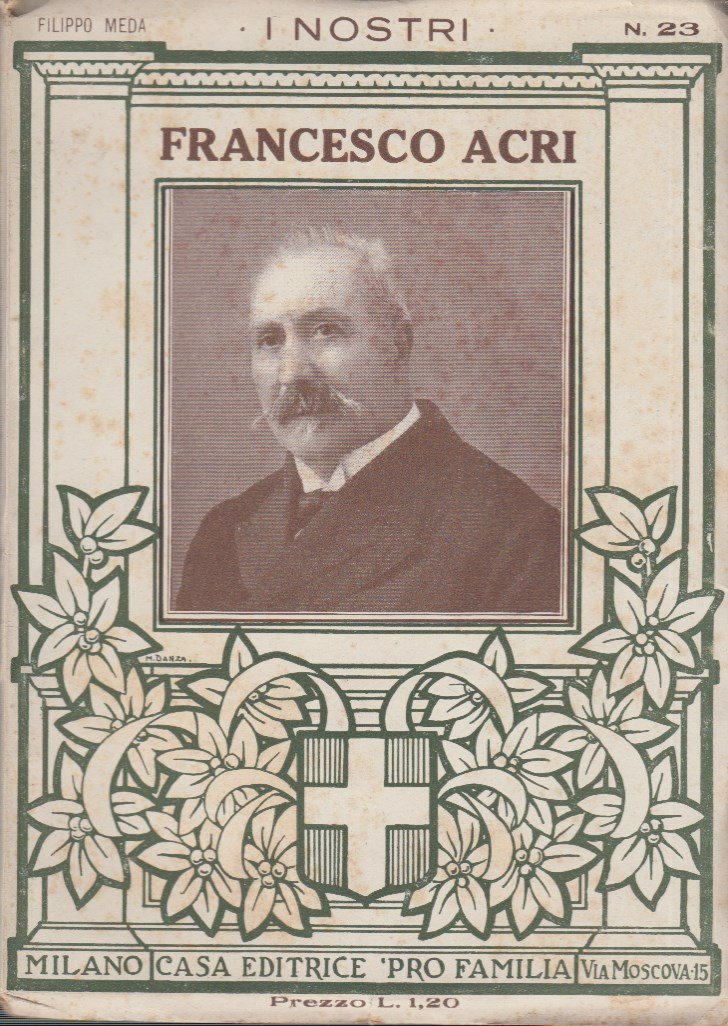 In-16 (Cm 17,3 x 12,2), pp. 56, brossura editoriale illustrata [M. Danza]. Collana I Nostri 23, dedicata a personalità cattoliche più cospicue e meritevoli nel campo dell'apostolato religioso, dell'azione cristiano-sociale, della politica, della scienza, dell'arte e della beneficenza. Normali segni del tempo. OTTIMO - Francesco Acri: Catanzaro 19 Marzo 1834 - Bologna 21 Novembre 1913, è stato un filosofo e storico della filosofia.