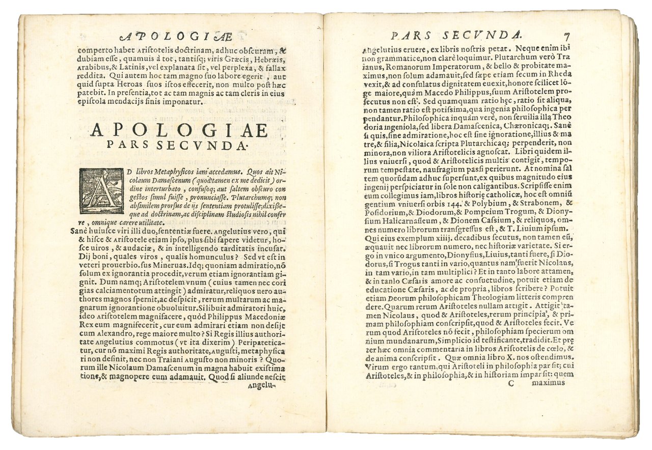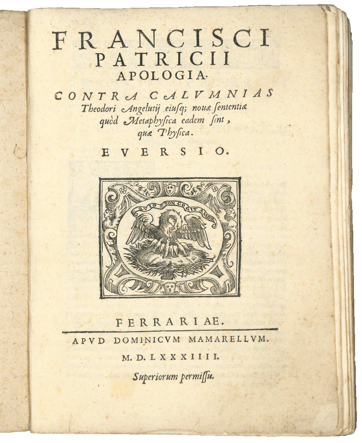 Extremely rare first edition, dedicated by Patrizi to Cesare Cremonini (1557-1631), professor of natural philosophy at the universities of Ferrara and Padua. In 1584, Teodoro Angelucci (d. ca. 1600) attacked Patrizi's interpretation of Aristotelian metaphysics in his Quod metaphysica sint eadem, quae physica, nova Theodori Angelutii sententia (Venice, 1584). Patrizi replied with the Apologia contra calumnias Angelutti, to which his opponent responded with the Exercitationum Theodori Angelutii cum Francisco Patritio. Liber primus. In quo de metaphycorum authore, appellatione, & dispositione disputatur. Et quod metaphysica sint eadem quae physica iterum asseritur (Venice, 1585), criticising him for favouring the enigmatic Pythagoras, Zoroaster and Hermes Trismegistus over the enlightened Aristotle. A reflection of this dispute can be found in the Disceptationum libri V contra calumnias Angelutii by Francesco Muti (Ferrara, 1588), a follower of Telesio, whose theses are so close to those of Patrizi that Pierre Bayle attributed the writing to the latter (cf. M. Palumbo, Patrizi, Francesco, in: “Dizionario Biografico degli Italiani”, 81, Rome, 2014, s.v.).