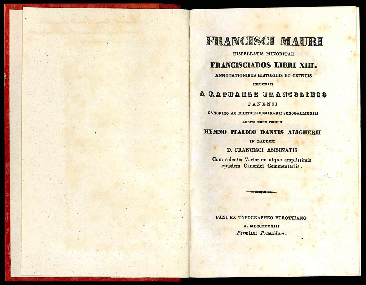 Francisciados libri XIII annotationibus historicis et criticis inlustrati a Raphaele Francolinio fanensi canonico ac rhetore seminarii senogalliensis addito nunc primum hymno italico Dantis Aligherii in laudem D. Francisci asisinatis. Cum selectis Variorum atque amplissimis ajusdem Canonici Commentariis.