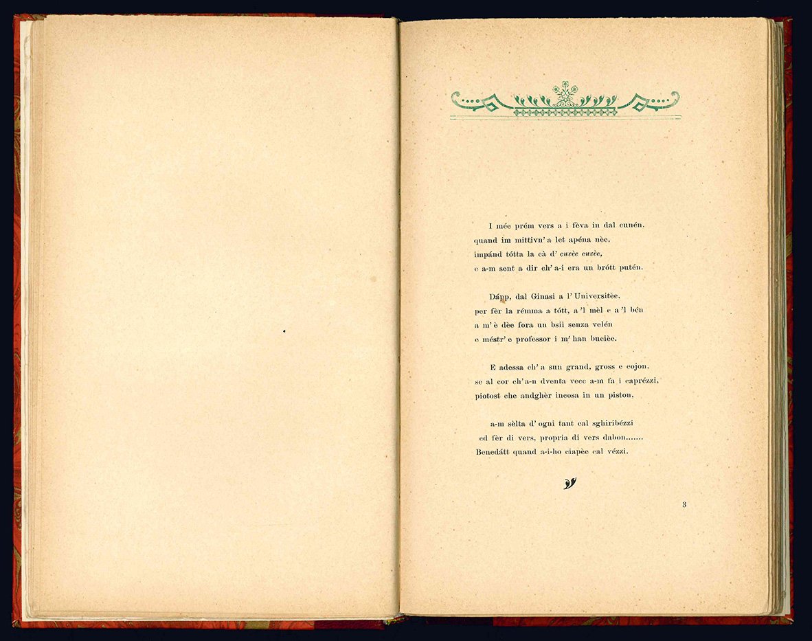 In 8vo (mm 210x127); pp. XV, [1], 110. Mezza pelle recente con filetti e titolo in oro al dorso. Piatti rivestiti con carta marmorizzata. Sono conservate le copertine originali. Lieve alone alla copertina anteriore, carta leggermente ed uniformemente brunita, ma nel complesso ottima copia.