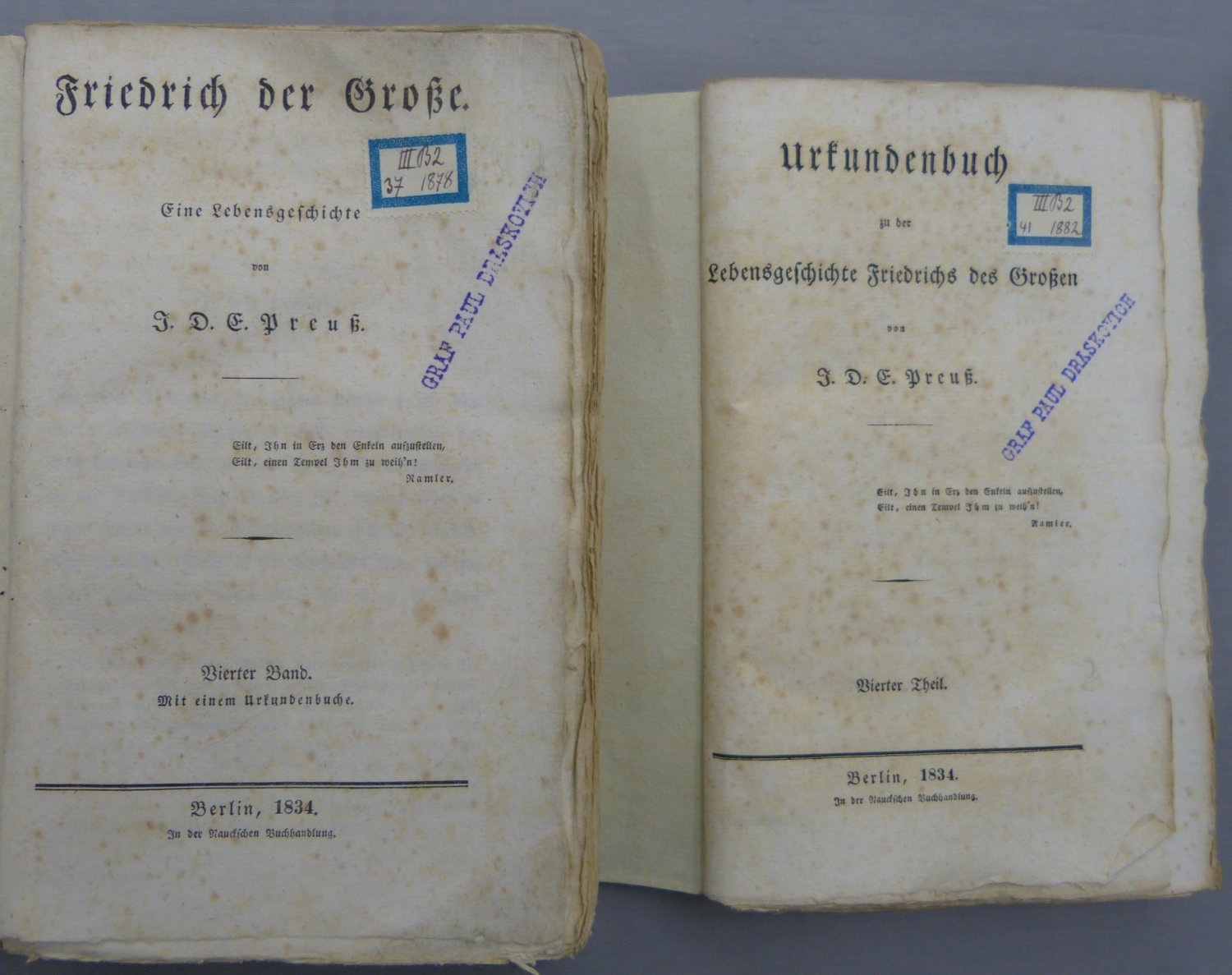 • Einband etwas gebräunt und fleckig. Rücken etwas knickspurig und mit mehreren kleinen Fehlstellen entlang der Scharniere. Namensstempel und private Signatur einer gräflichen Bibliothek (Draskovich) auf dem Titelblatt. Papier innen etwas fleckig, sonst gut erhalten. Altersentsprechend noch guter Zustand.