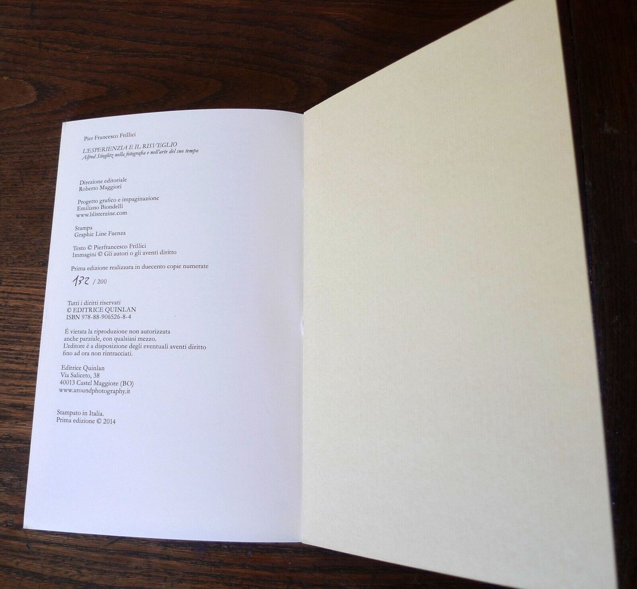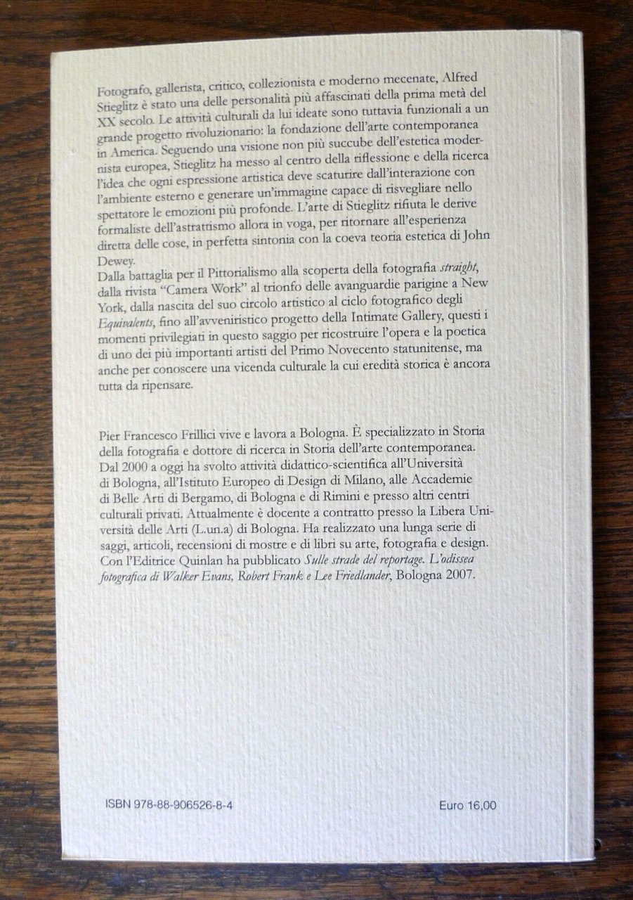 Pier Francesco Frillici,L'ESPERIENZA E IL RISVEGLIO.Alfred Stieglitz nella fotografiae nell'arte del suo tempo.Introduzione di Claudio Marra.Editrice Quinlan, Castel Maggiore (BO) 2014,PRIMA EDIZIONE REALIZZATA IN 200 COPIE NUMERATE,ESEMPLARE N.132,brossura, 18,5x12 cm., pp.99,illustrazioni in bianco e nero,ISBN: 978-88-906526-8-4,peso: g.200