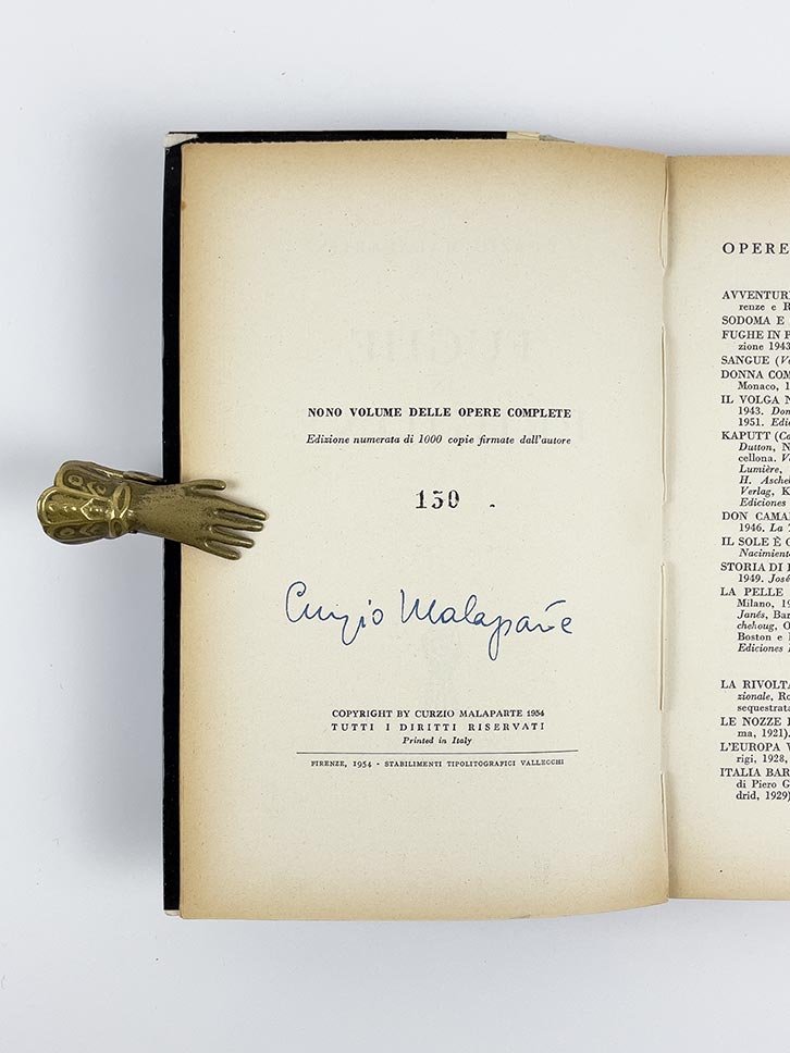 LIBROTerza edizione.Esemplare 150/1000 con firma autografa dell’autore al colophon; segni del tempo marginali alla sovracoperta, con minime mancanze al taglio superiore del piatto posteriore e agli angolini sul piatto anteriore; interno in ottime condizioni, nota manoscritta alla prima carta «2612 Roma 1955».Raro. Con nuova prefazione inedita datata settembre 1954, incentrata sulla memoria di Cesare Pavese, che a dire di Malaparte non era riuscito a «fuggire in prigione». Il libro è pubblicato dietro concessione Vallecchi, editore che pubblica la prima (1936), la seconda (1943) e la terza edizione in contemporanea a questa di Aria d’Italia.