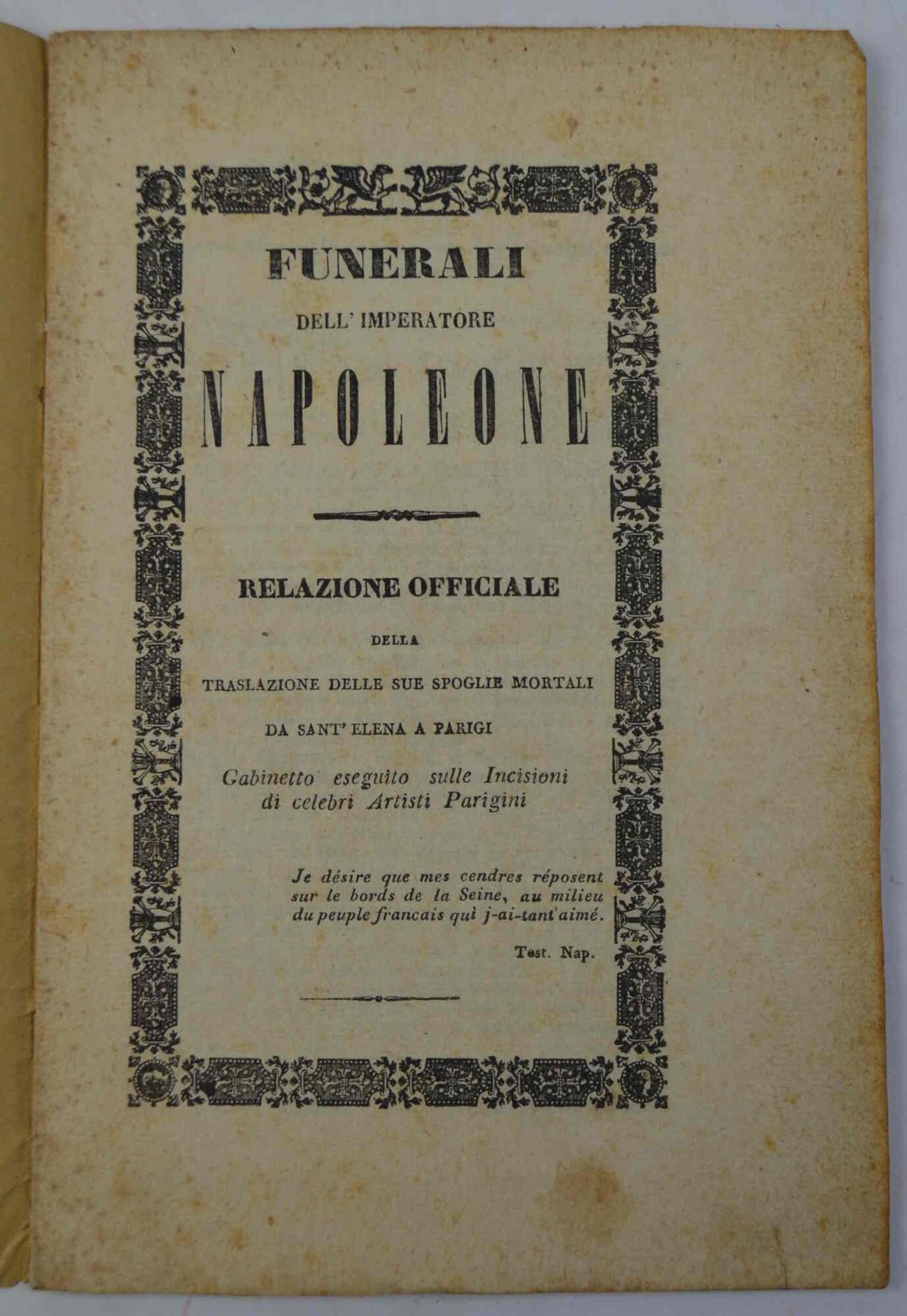 Funerali dell'imperatore Napoleone. Relazione officiale della traslazione delle sue spoglie mortali da Sant'Elena a Parigi Gabinetto eseguito sulle incisioni di celebri artisti parigini.