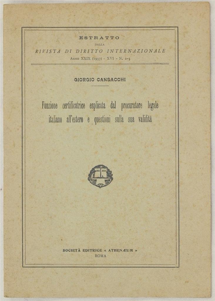 In 8. Dim. 24x17 cm. Pp. 16. Interessante pubblicazione di diritto scritta da Giorgio Cansacchi. Estratto dalla Rivista di Diritto Internazionale del 1937, n. 2-3. Cansacchi descrive la funzione certificatrice esplicata dal procuratore legale italiano all'estero e questioni sulla sua validità. Brossura editoriale originale. In ottime condizioni. Copertina editoriale in ottime condizioni generali con lievi usure ai margini e dorso. Legatura in ottime condizioni. All'interno le pagine si presentano in ottime condizioni con rare fioriture. Interesting pamphlet of right written by Giorgio Cansacchi. Extract from the Rivista di Diritto Internazionale del 1937, n. 2-3. Cansacchi describes the certificative function explained by italian procuree in foreign countries and issues about its validity. Editorial original cover. In very good conditions. Editorial cover in very good general conditions slightly worn in the edges and spine. Binding in very good conditions. Inside pages are in very good conditions with occasional foxings.