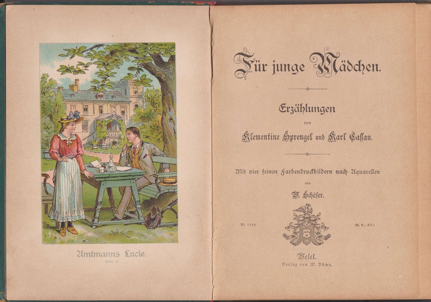 Mit einem Frontispiz und 2 weiteren farbigen Abbildungstafeln. Enthält die Erzählungen: Amtmanns Lucie (Sprengel). - Die Nachbarskinder (Sprengel). - Wasserverkäufer oder Prinz ? (Cassau).