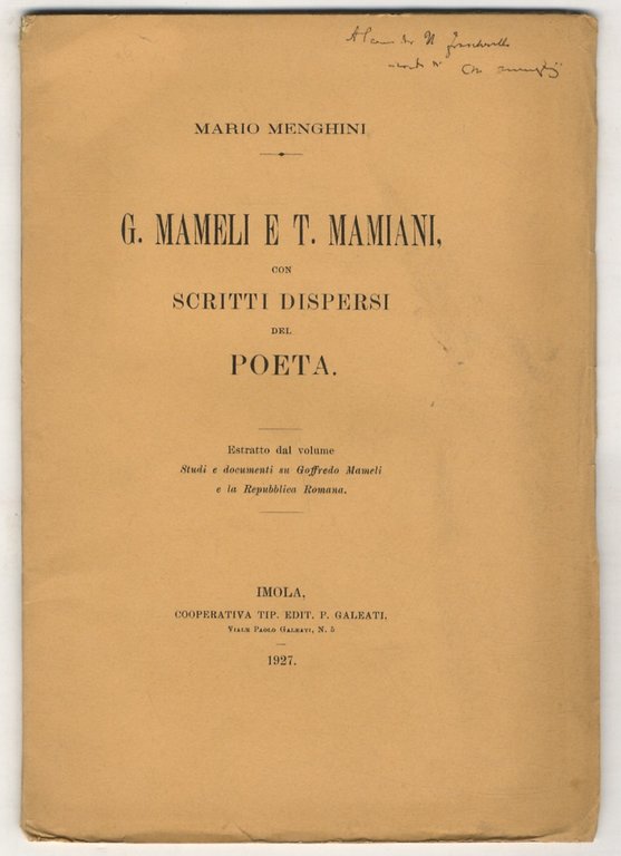 Imola, Galeati, 1927, in-8, brossura editoriale, pp. 28. Con un ritratto in b.n. di Mamiani. Estratto con invio autografo dell'Autore alla copertina anteriore.