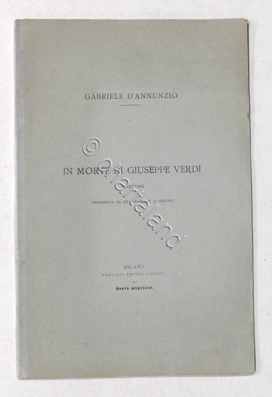Gabriele D'Annunzio - In morte di Giuseppe Verdi - Canzone preceduta da una orazione ai giovani - ed. 1920 Fratelli Treves Pag. 28 Copertina morbida - Testo in italiano. Condizioni molto buone. Dorso restaurato.